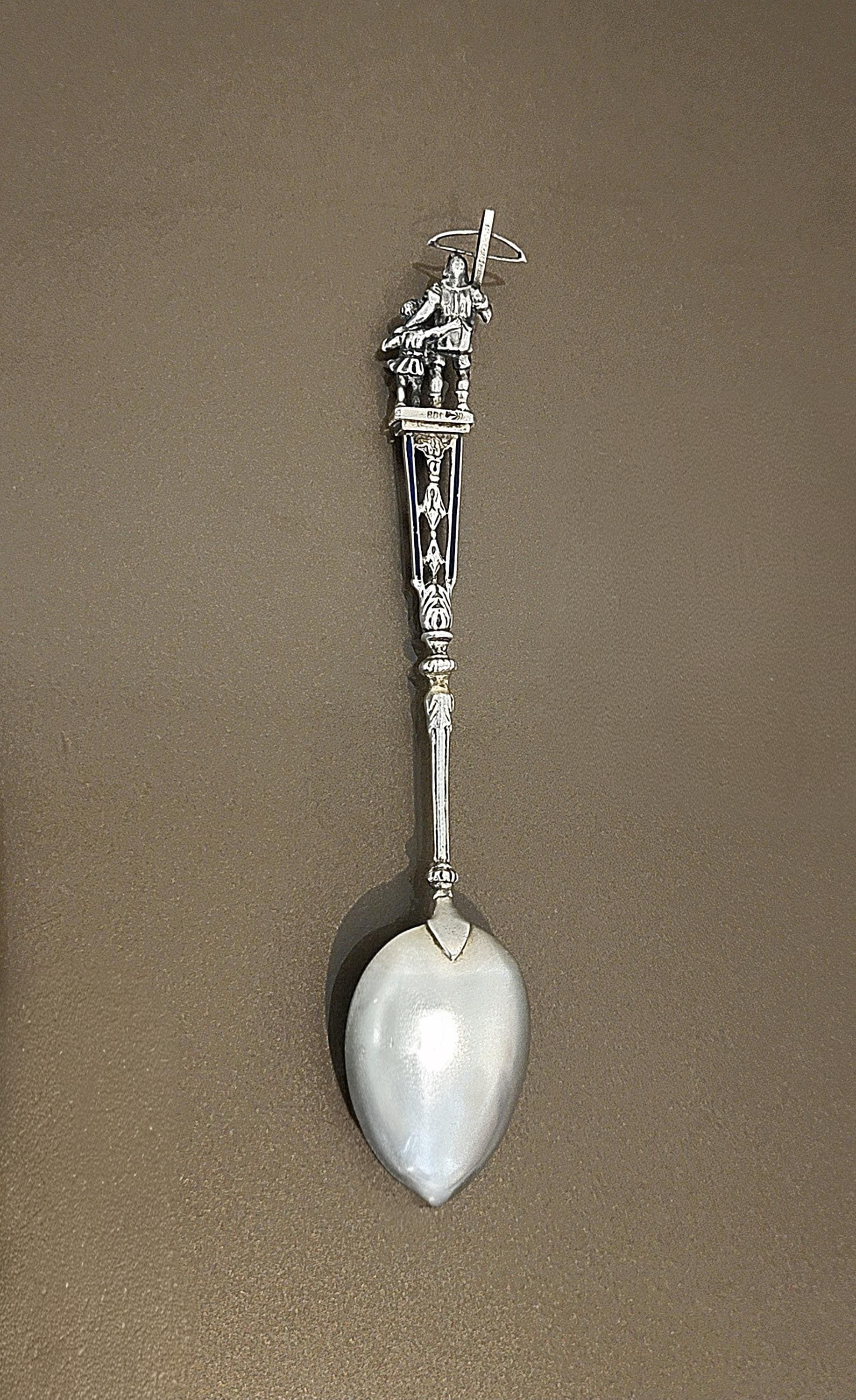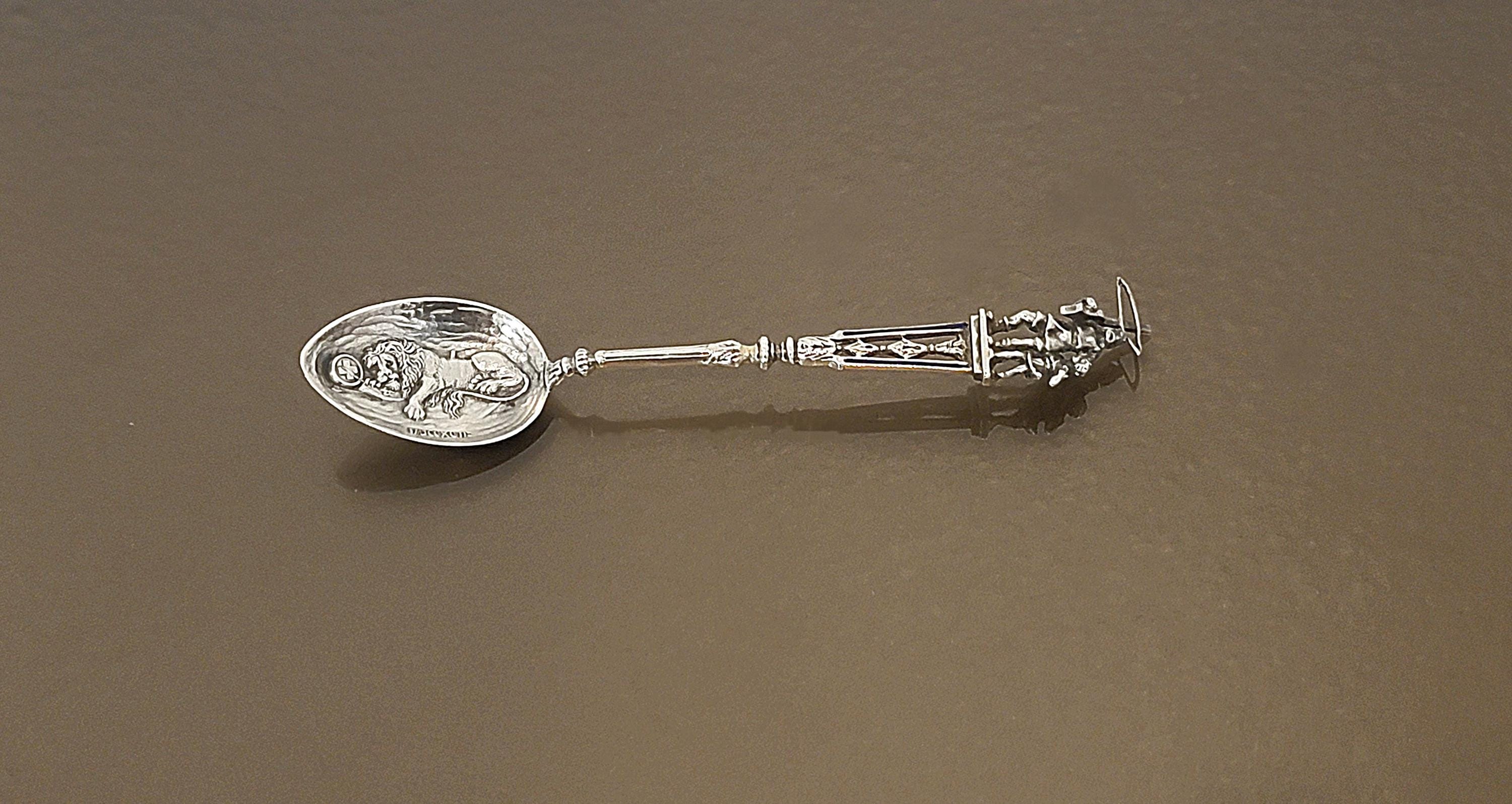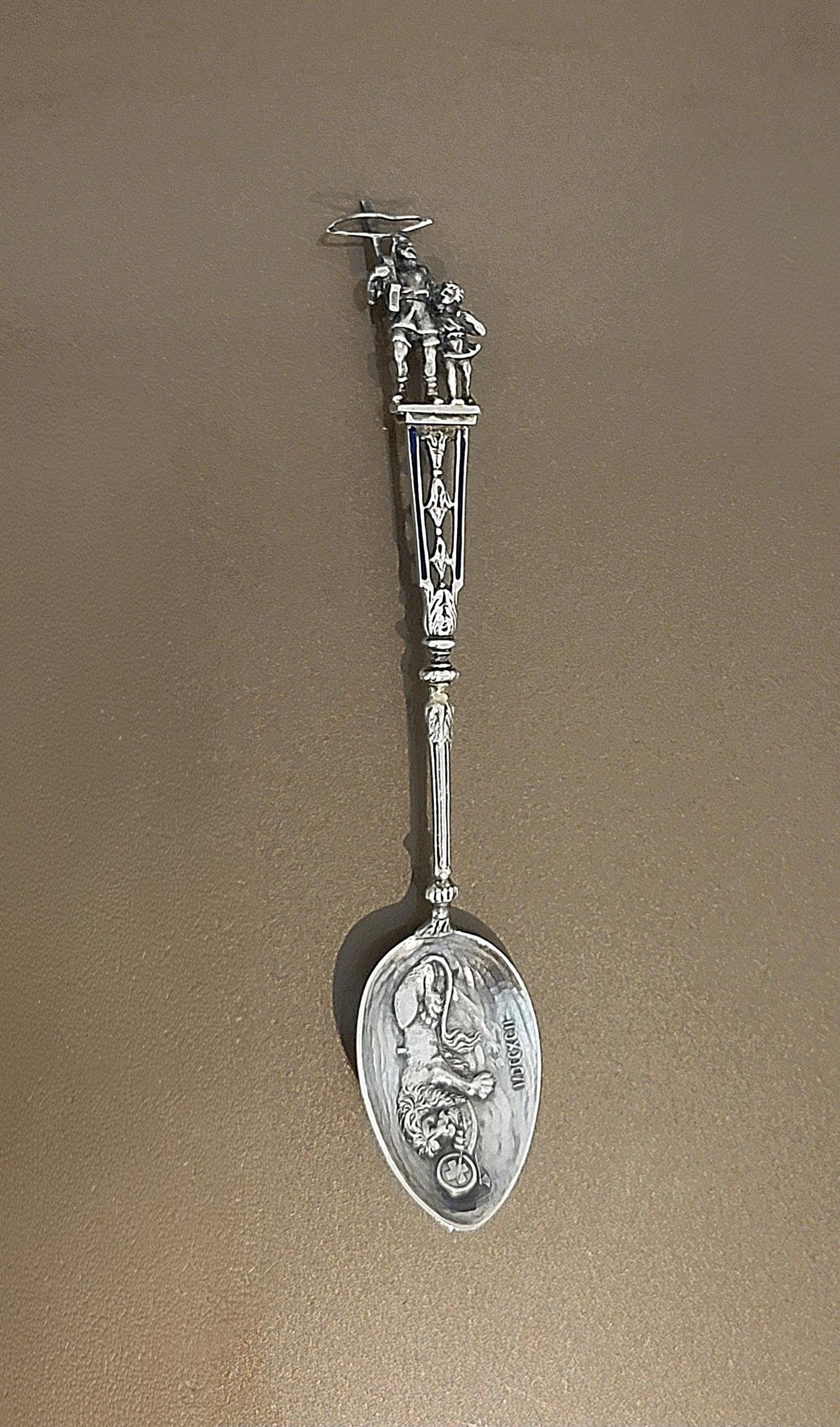 A striking late 19th century European figural spoon crafted in .800 fine silver, featuring a detailed medieval knight finial and a beautifully rendered lion in the bowl.