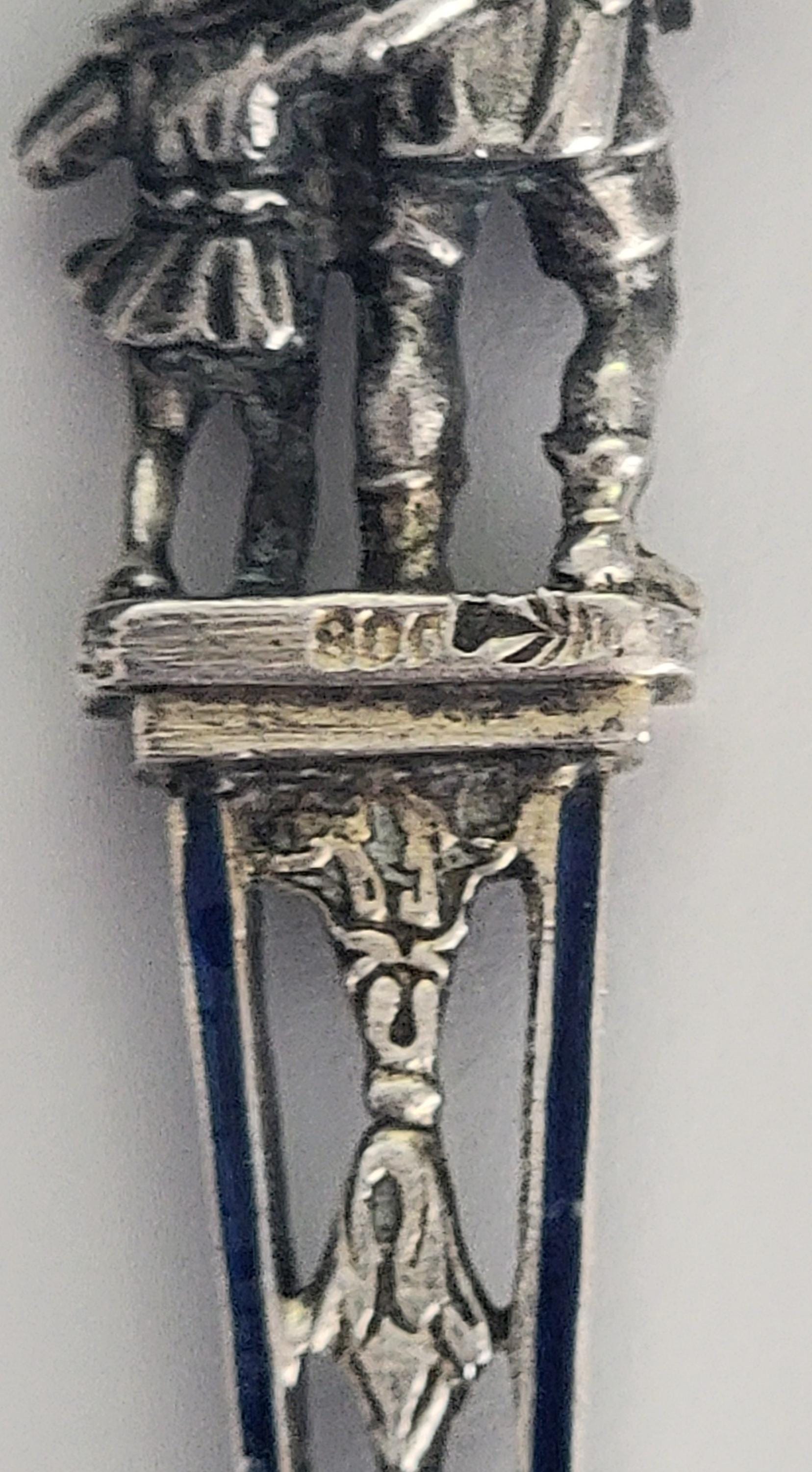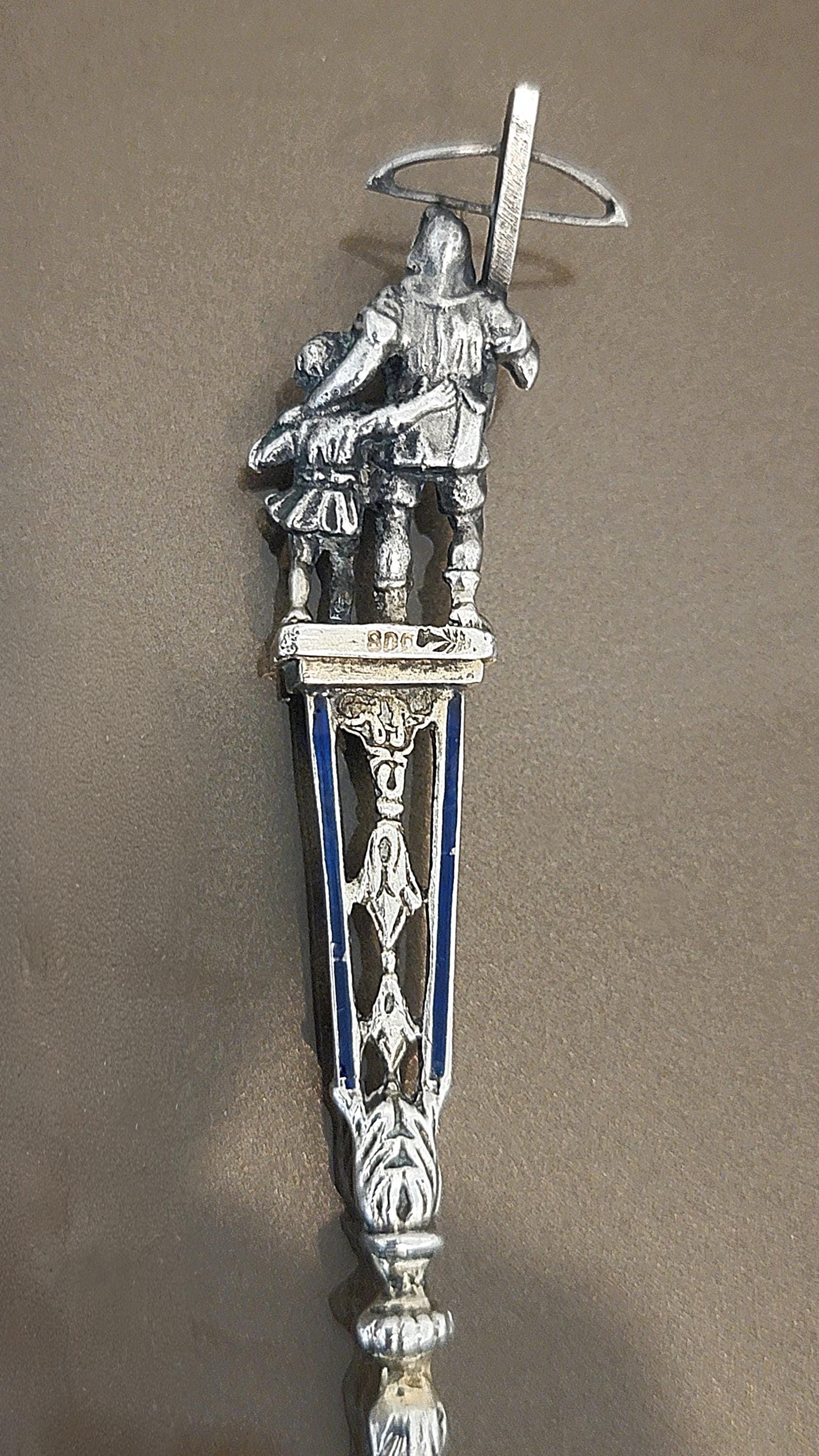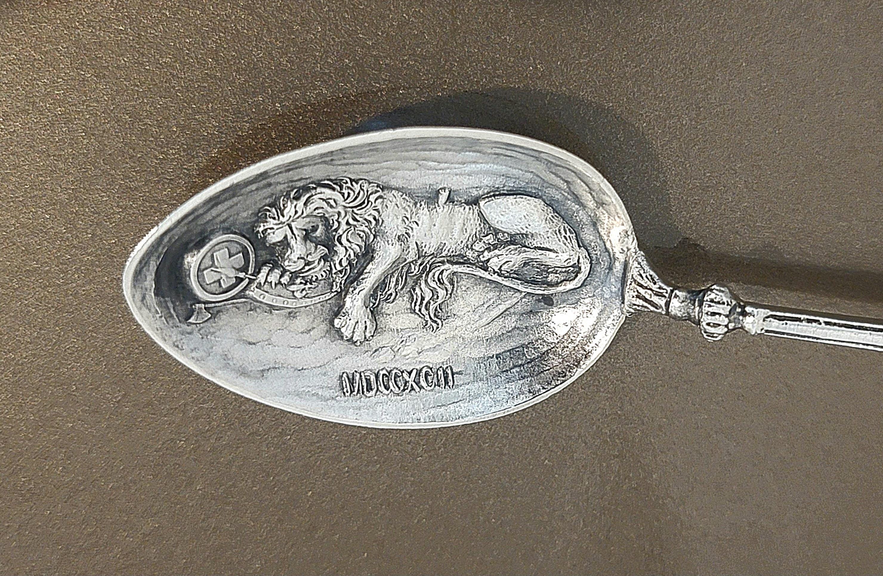 A striking late 19th century European figural spoon crafted in .800 fine silver, featuring a detailed medieval knight finial and a beautifully rendered lion in the bowl.