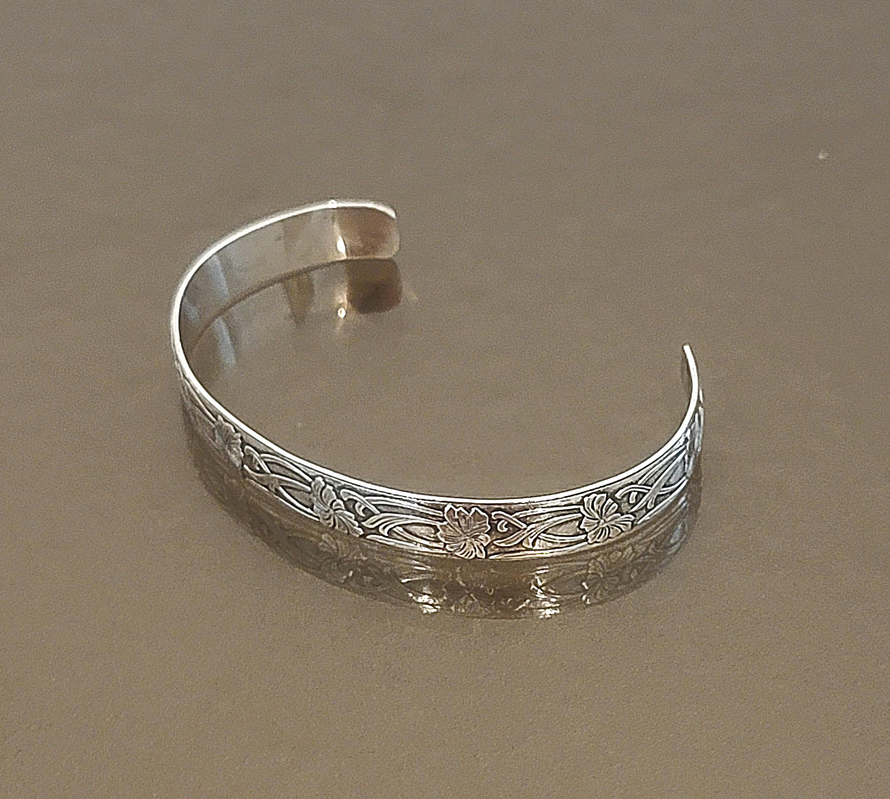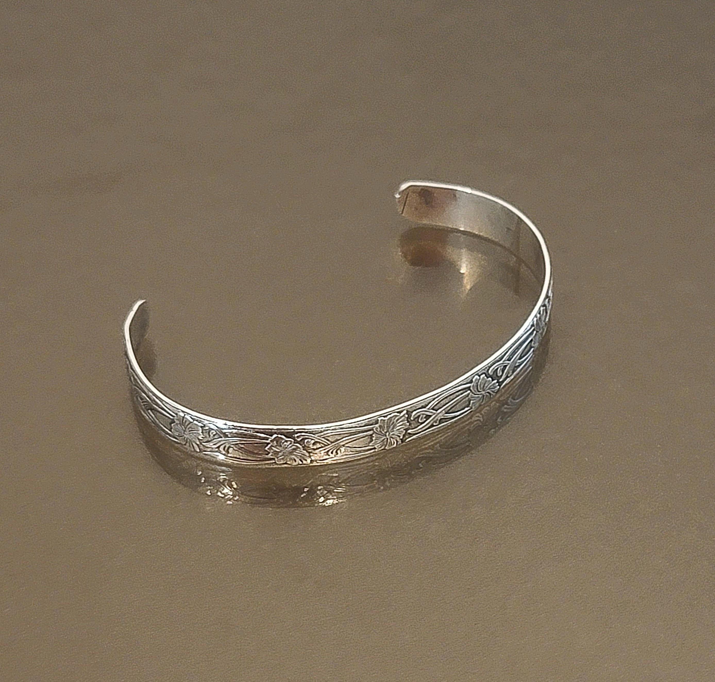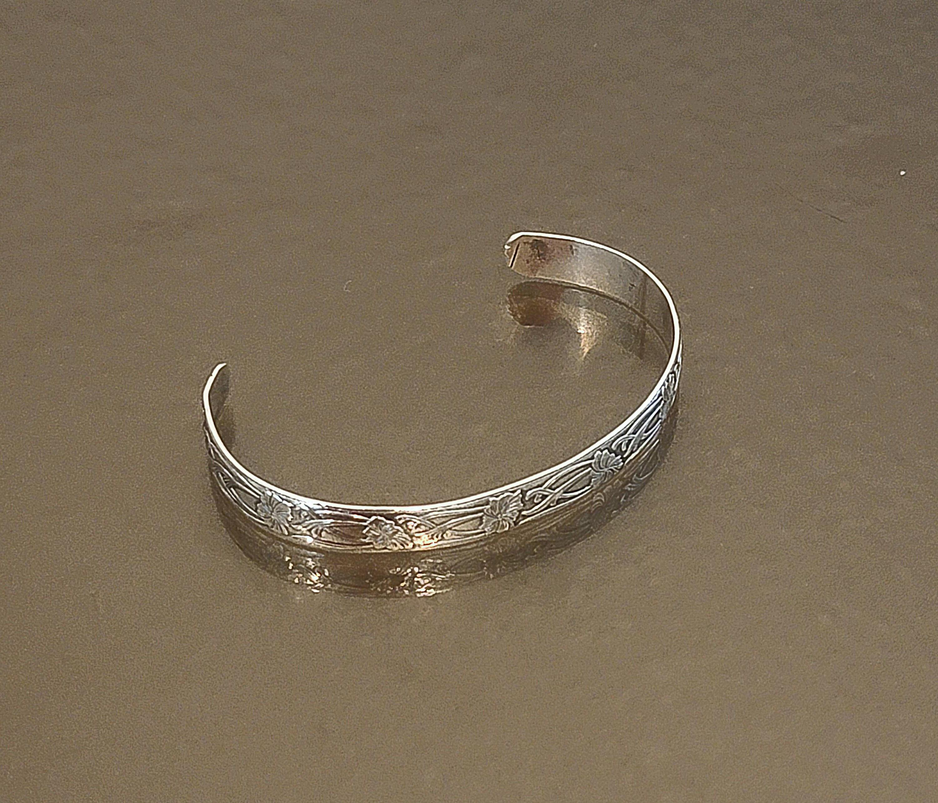 A beautifully detailed vintage sterling silver cuff bracelet, featuring an elegant floral and scrolling vine motif engraved along the outer band. Delicate blossoms flow through graceful curves, creating a timeless botanical design that feels both refined and easy to wear.