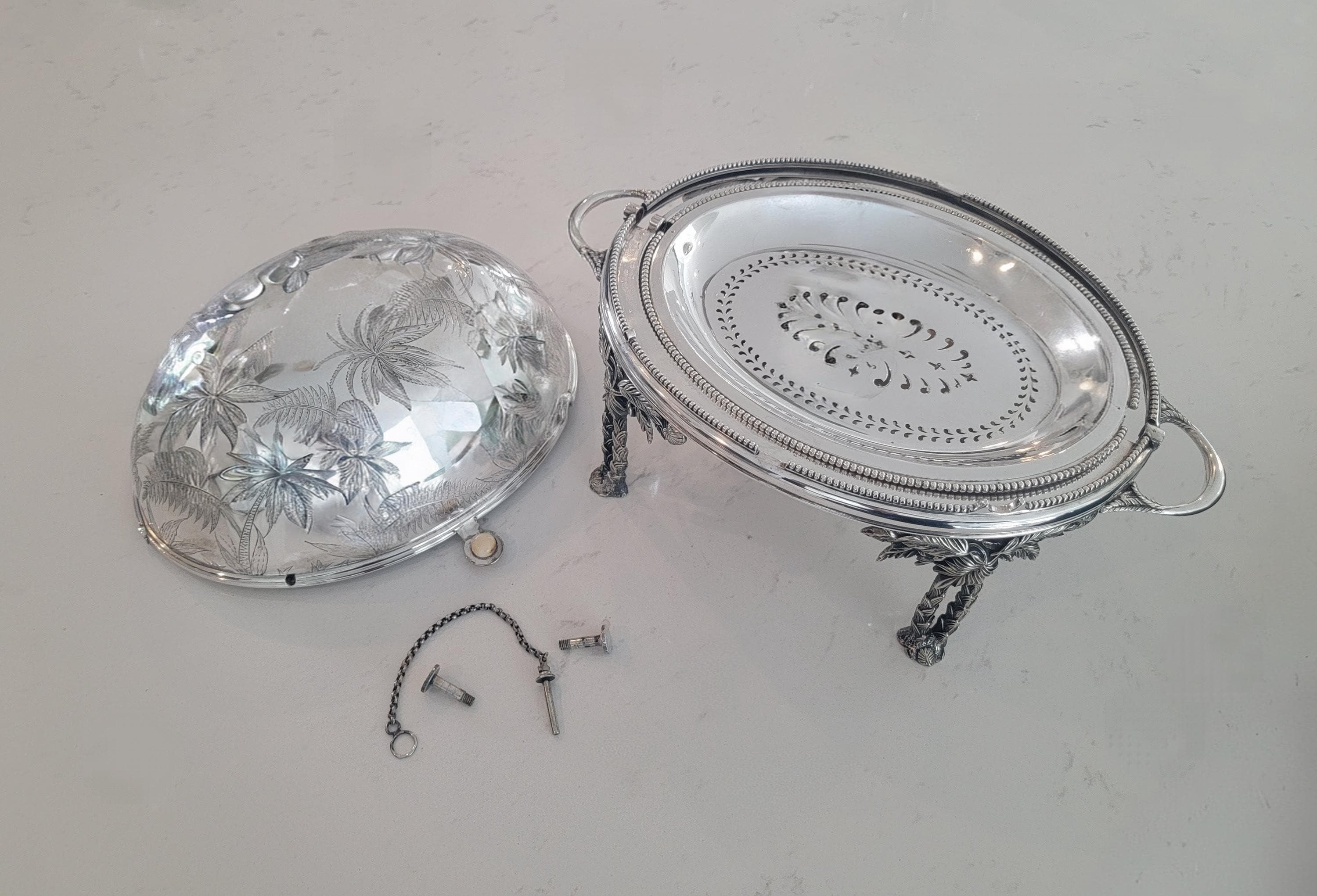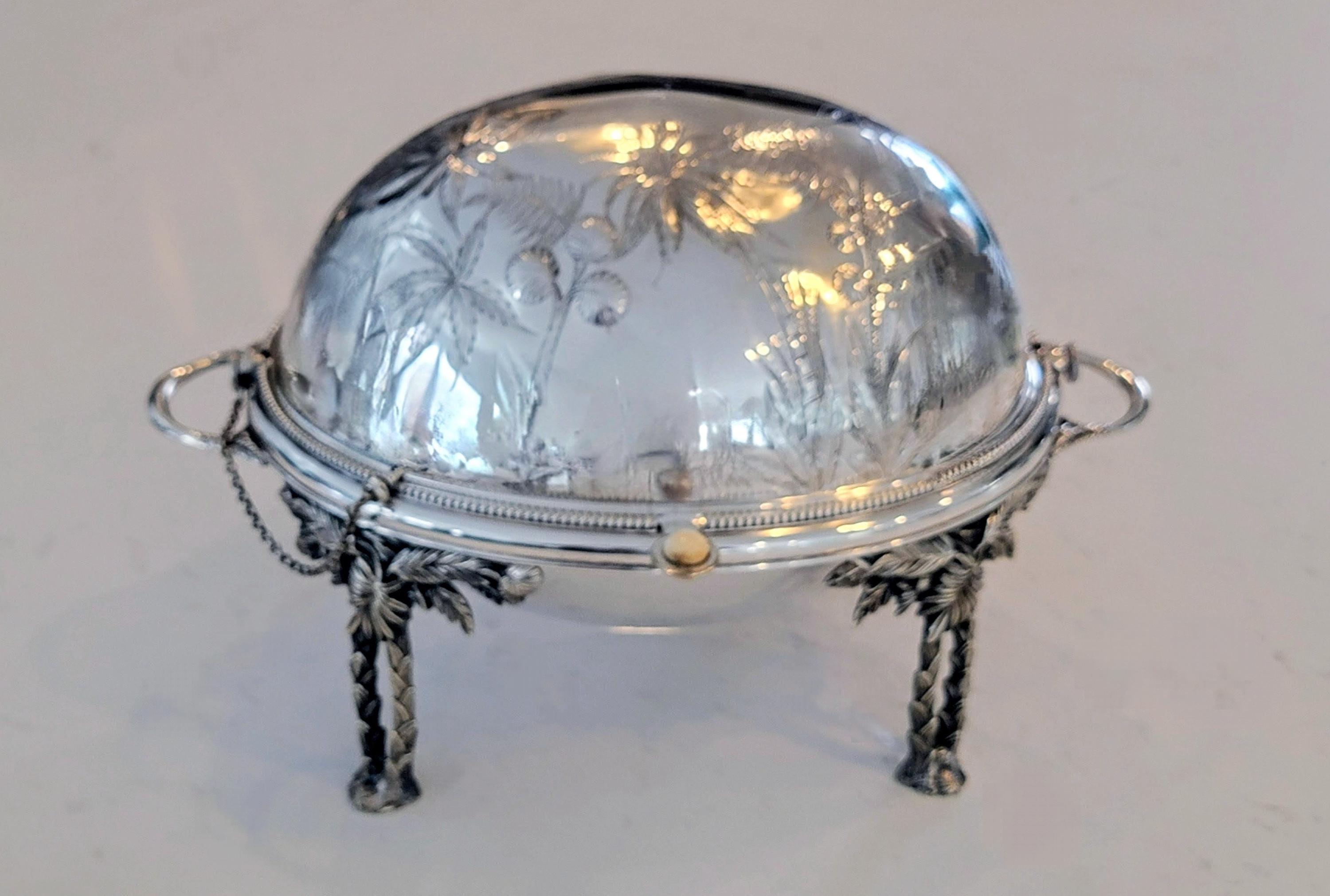 This dramatic Aesthetic Movement serving piece features a beautifully hand-engraved domed cover decorated with exotic palm and botanical motifs. The oval stand rests on three sculptural palm tree legs with richly textured trunks and layered fronds — an exceptional example of Victorian figural casting.
