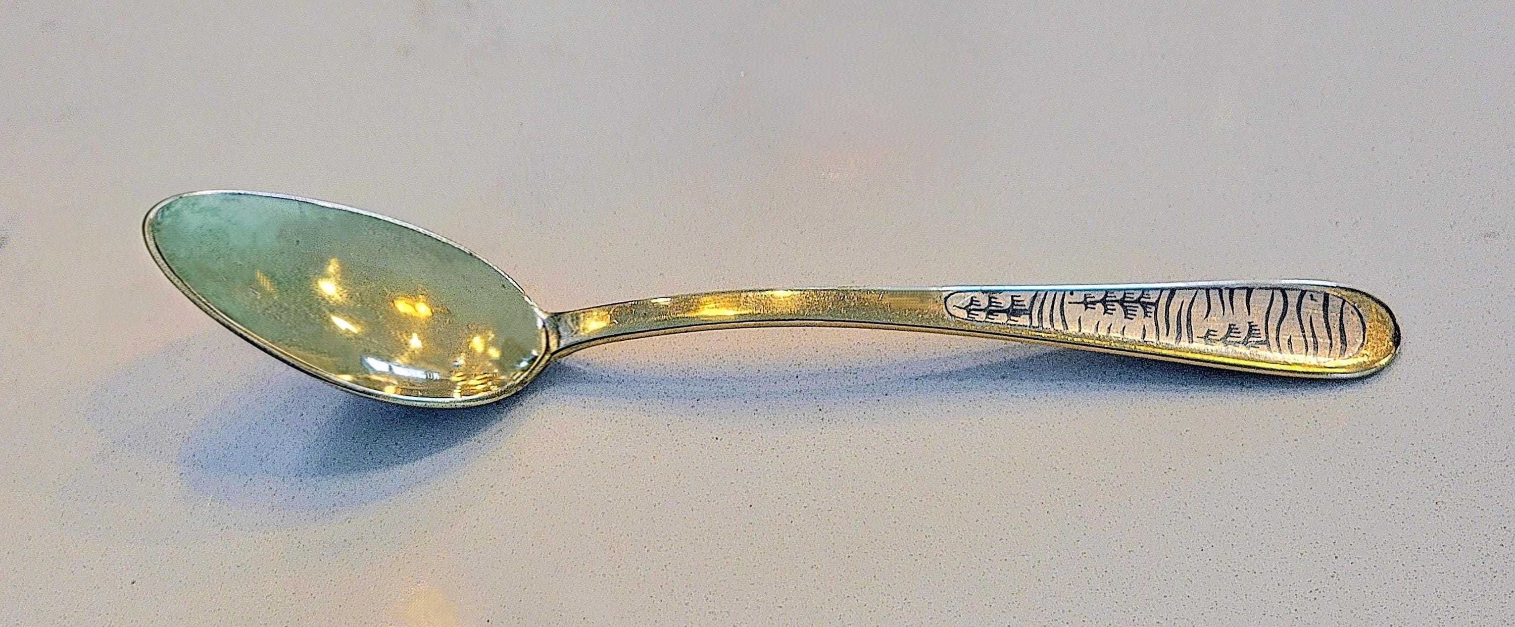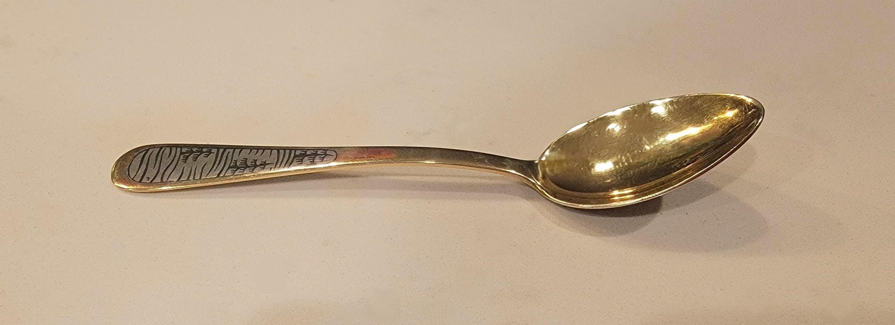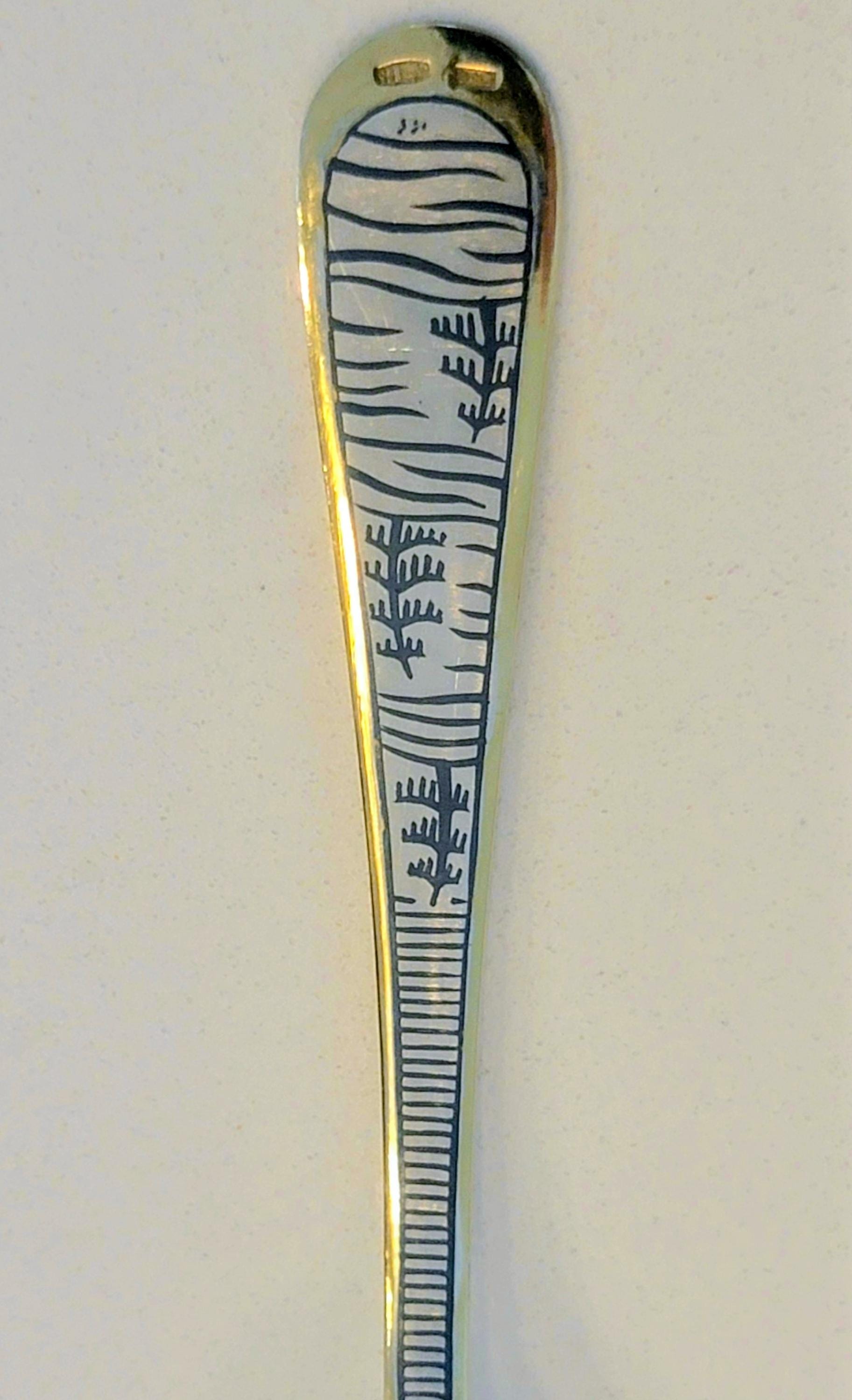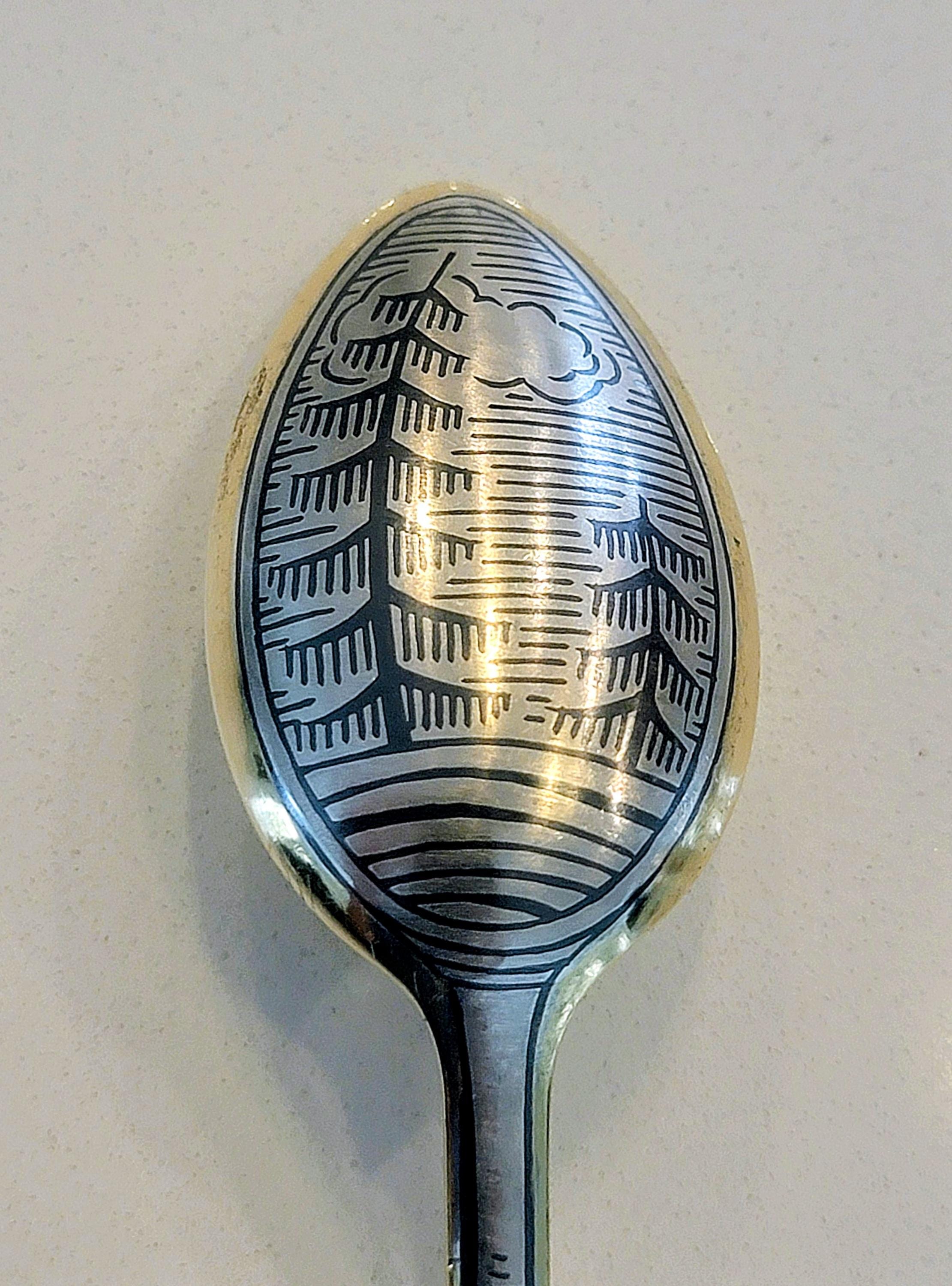 The deep black landscape scene on this spoon is classic Soviet niello work, highly collectible and increasingly sought after.