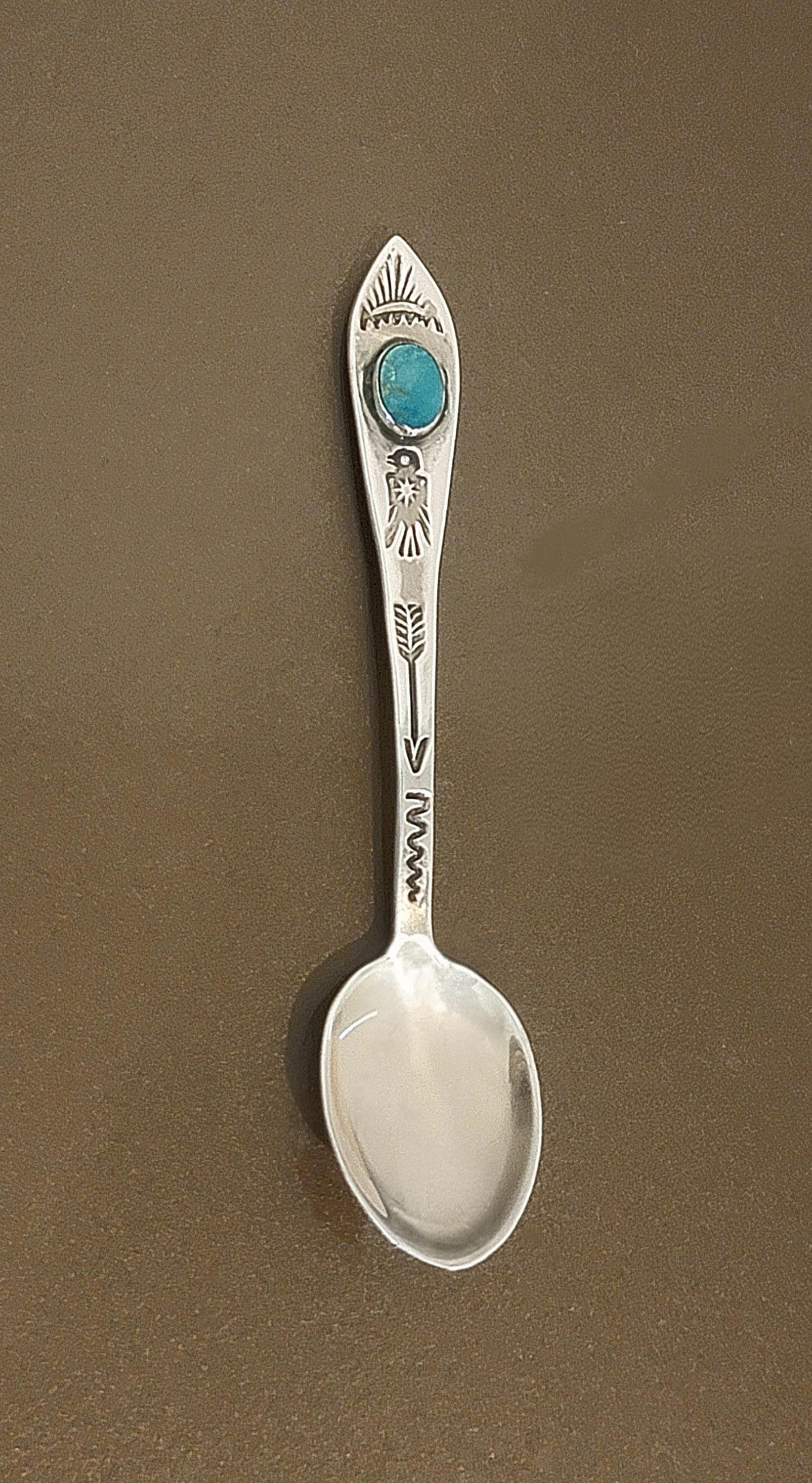 Beautiful vintage sterling silver Southwestern souvenir spoon featuring a genuine turquoise cabochon and traditional Native American–inspired symbolism.