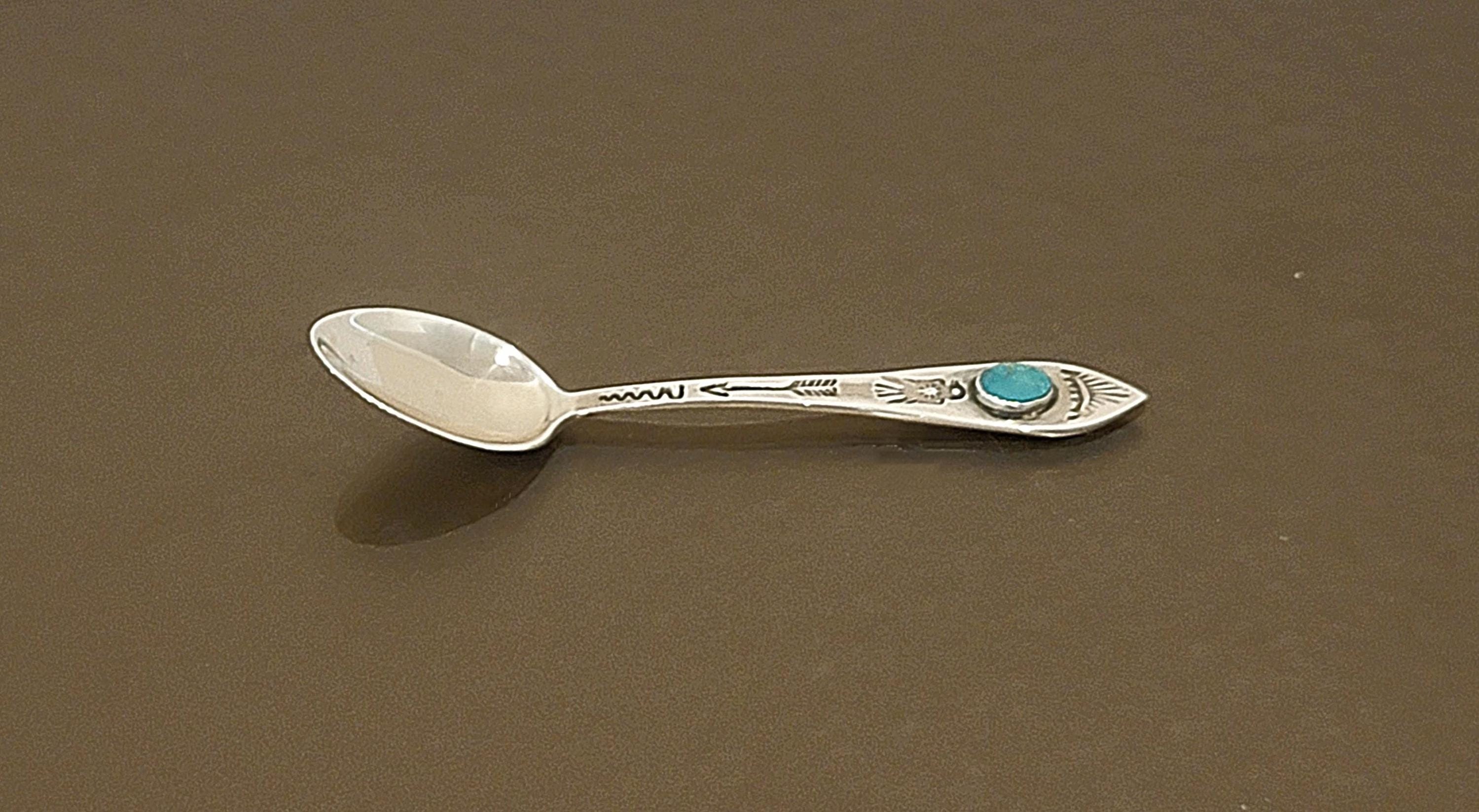 Small souvenir spoons like this were popular collectibles throughout the American Southwest during the mid-20th century and remain sought after today by collectors of turquoise jewelry, Native American art, and vintage sterling silver.