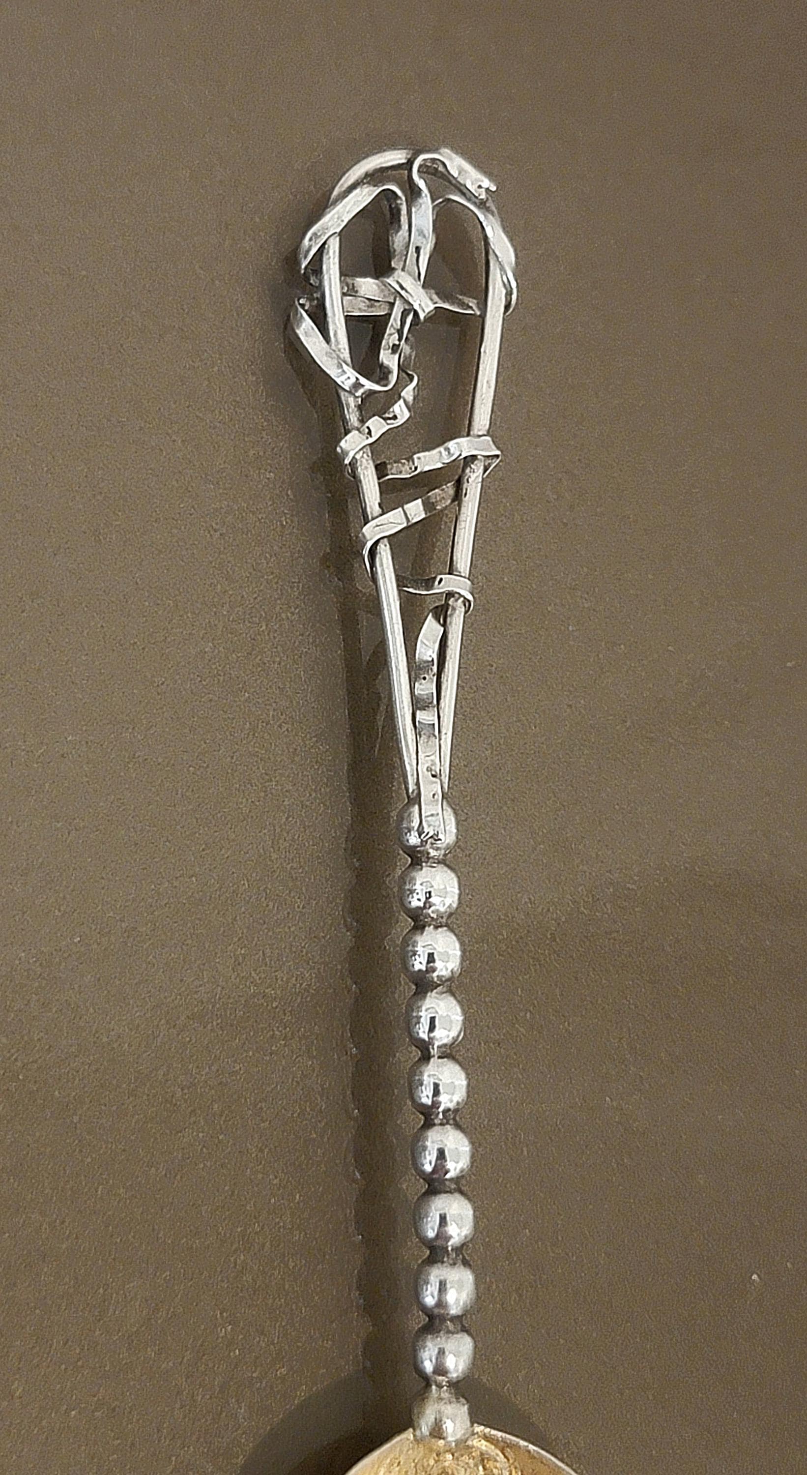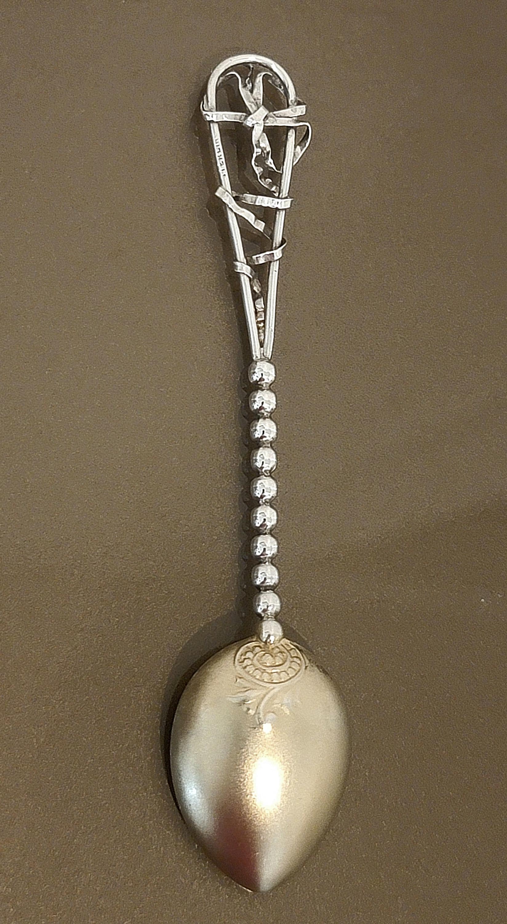 The handle is designed with a classic beaded motif, leading to a distinctive handcrafted sterling silver decorative element at the terminal. The piece combines traditional souvenir spoon design with a unique artisan flourish at the handle top, making it especially interesting for collectors.