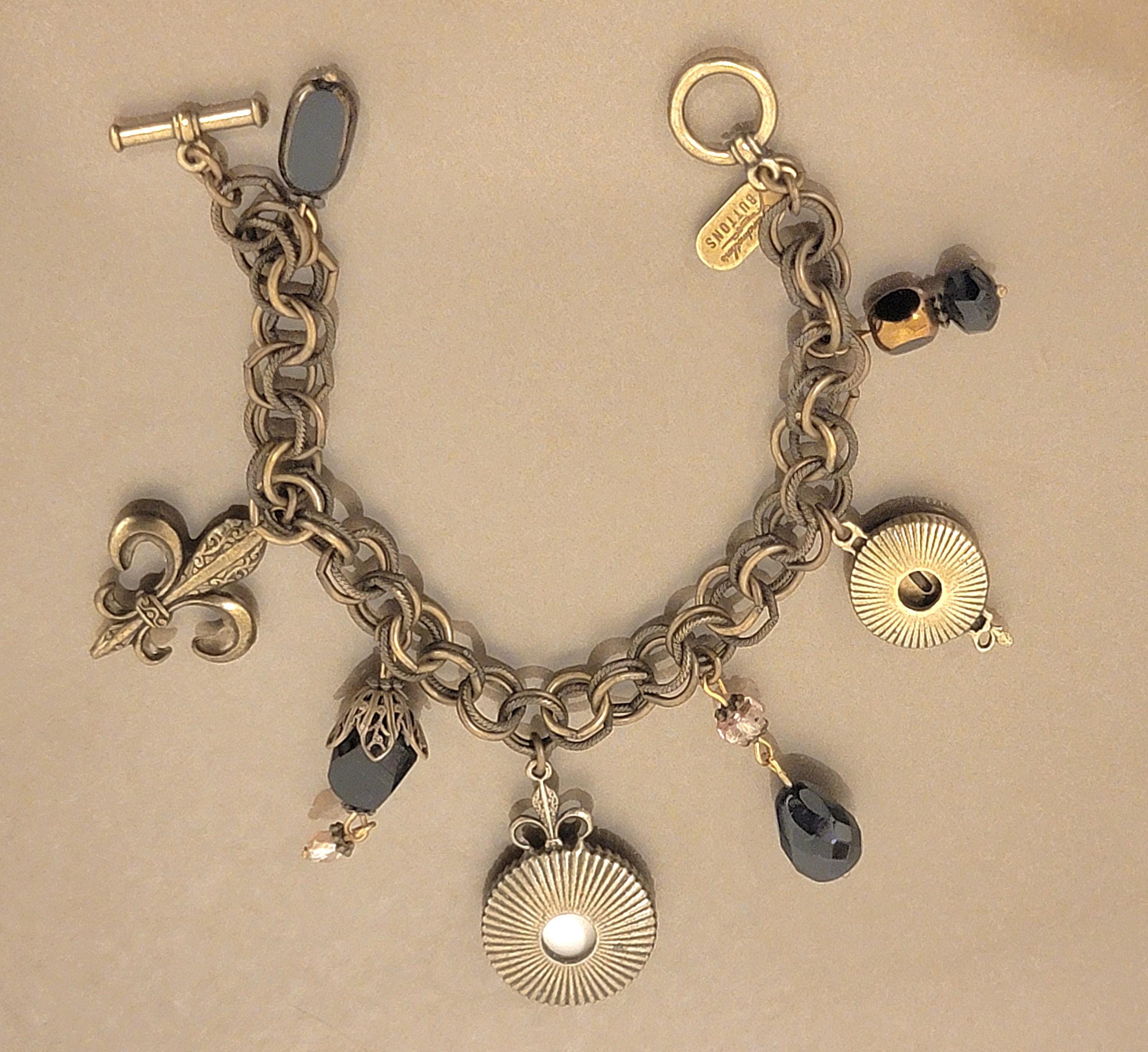 This distinctive Grandmother’s Buttons charm bracelet blends vintage inspiration with timeless New Orleans symbolism. Crafted in antiqued brass tones, the bracelet features a rich chain adorned with meaningful charms, including a miniature vintage photograph of a classic New Orleans streetcar, a Fleur-de-lis, and faceted black crystal accents.