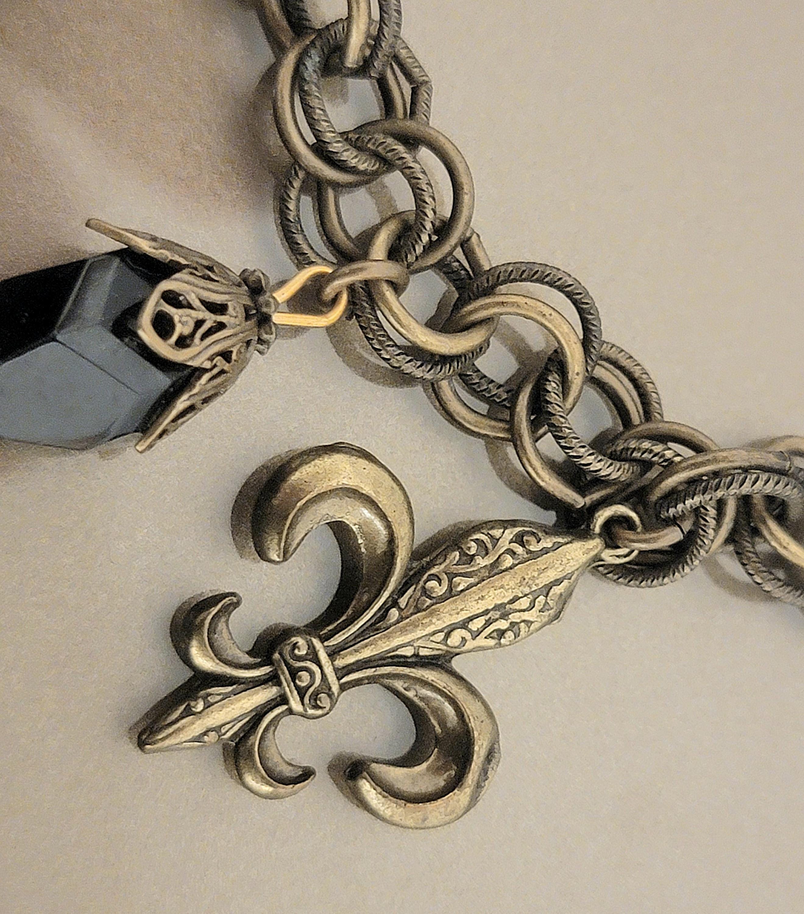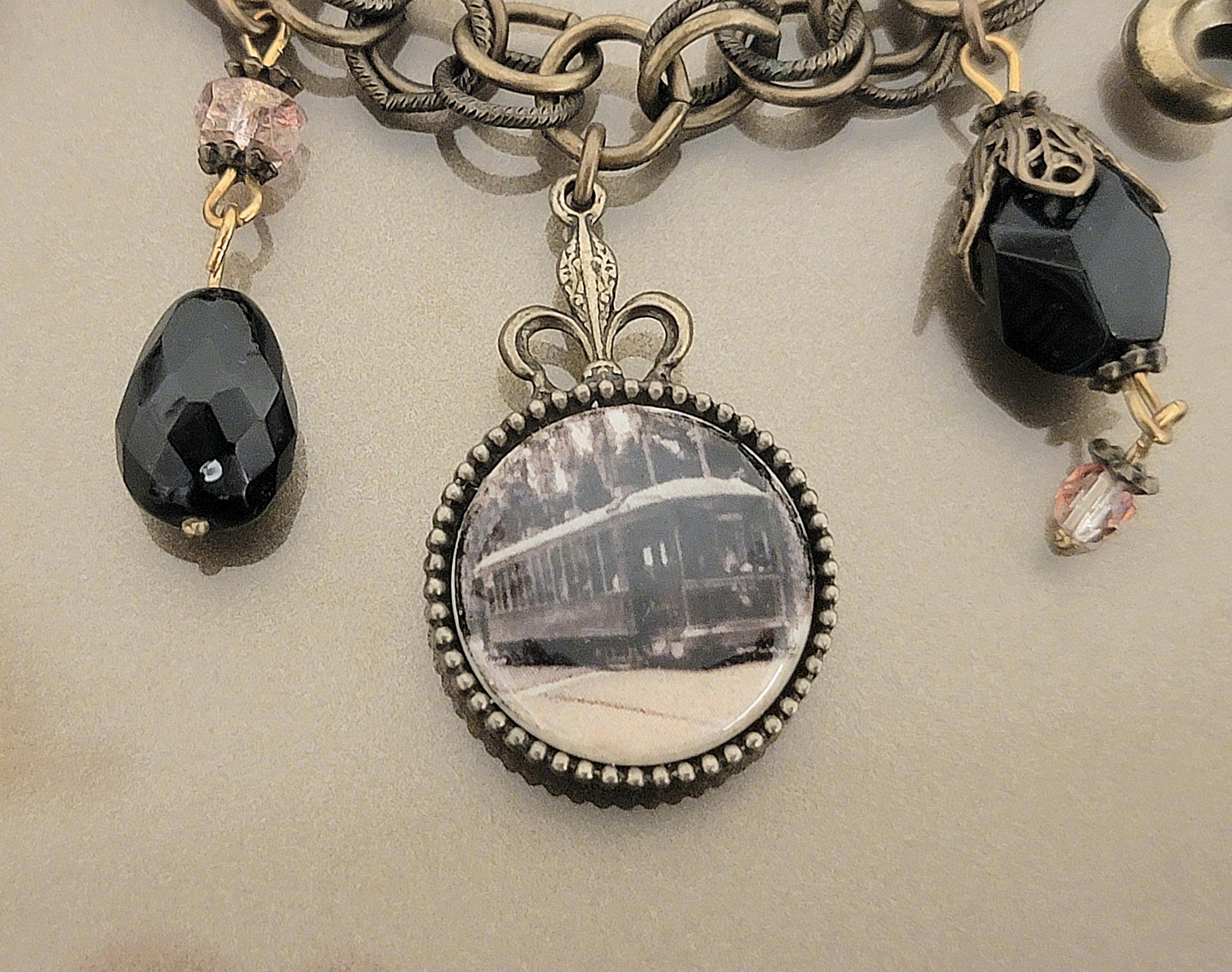 The centerpiece charm contains a tiny historic streetcar image, beautifully framed beneath glass. Alongside it hangs a detailed Fleur-de-lis, long associated with the culture and heritage of Louisiana. Black faceted crystals add subtle sparkle while maintaining the bracelet’s antique aesthetic.