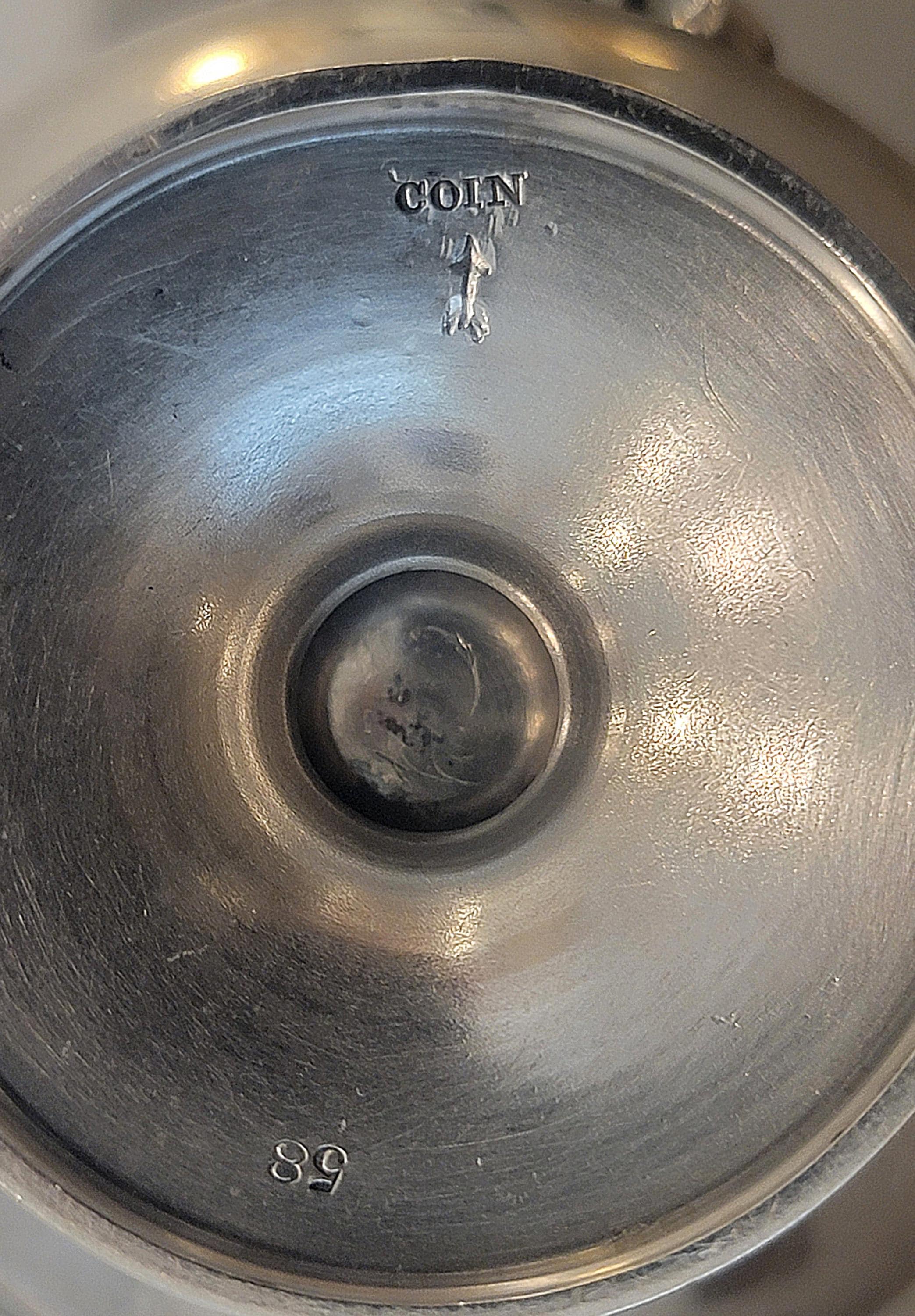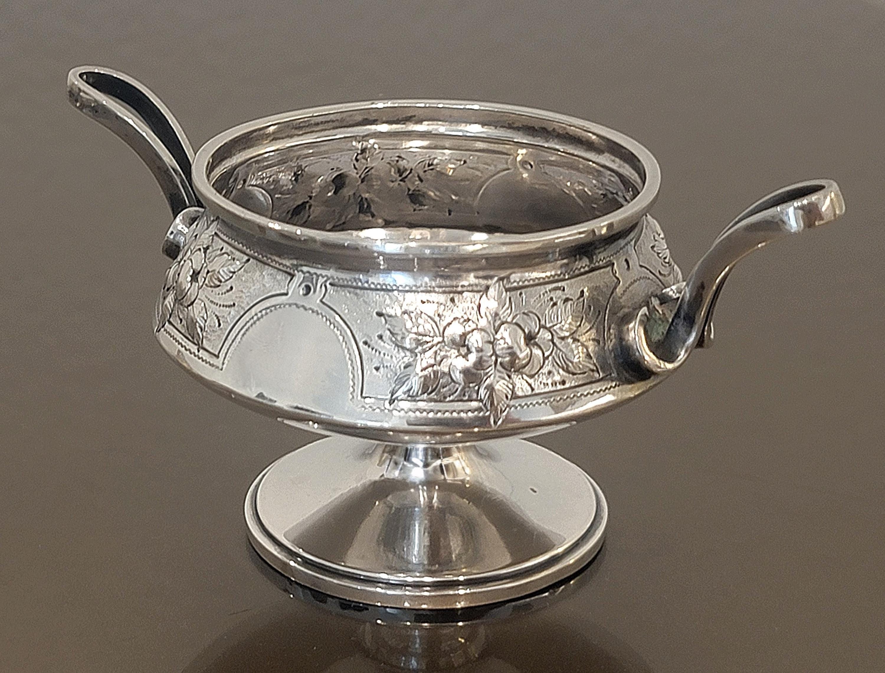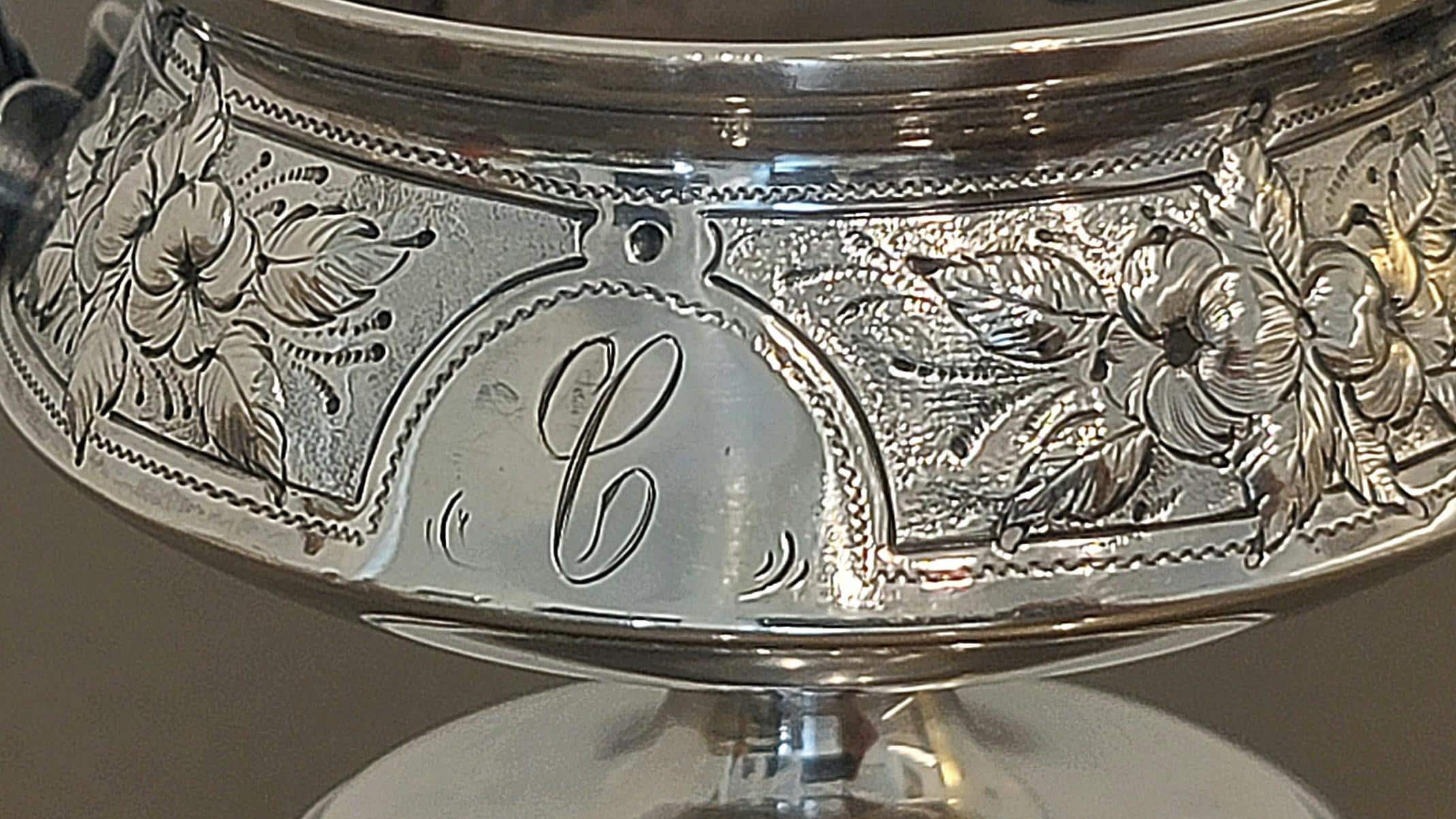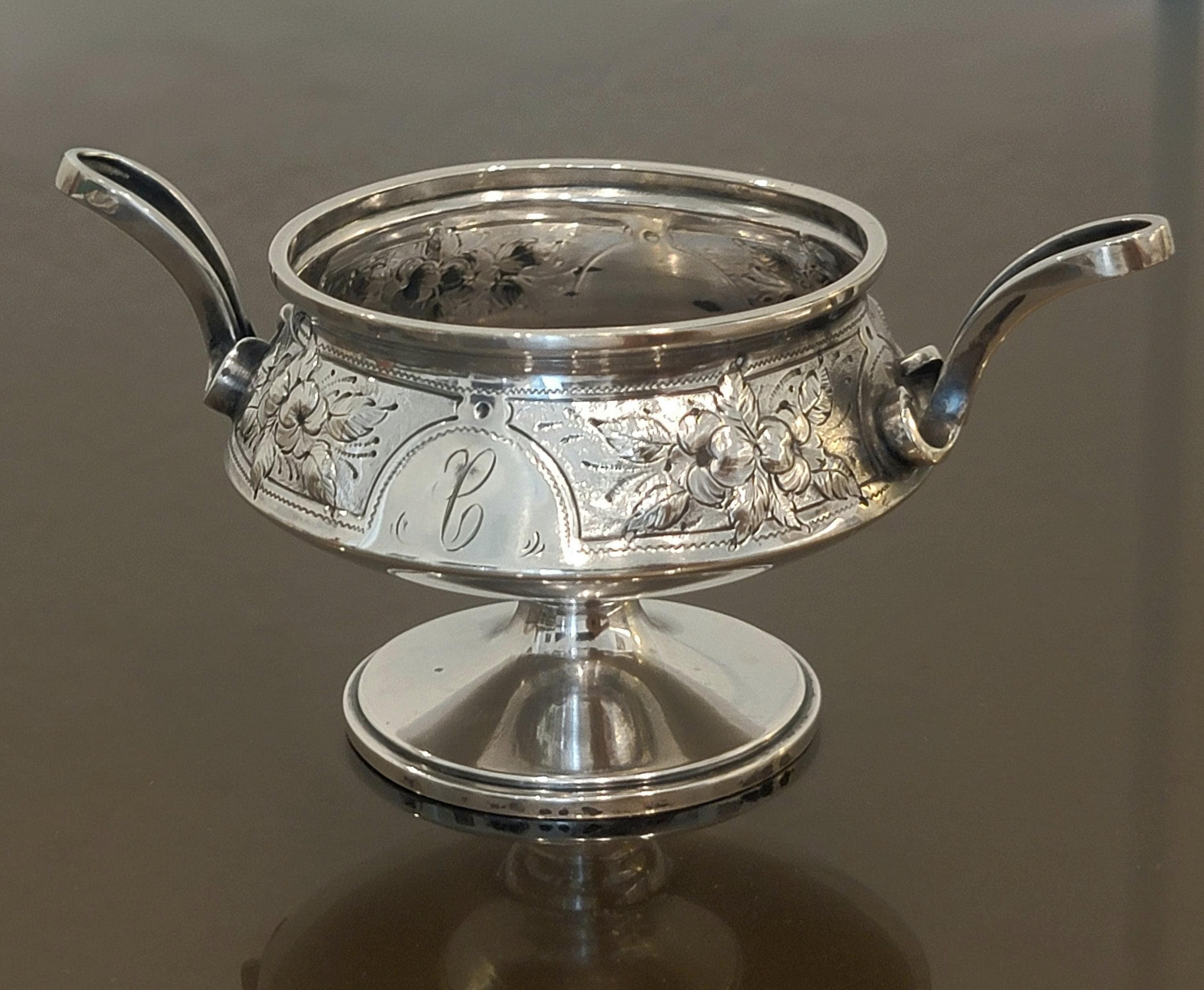 This early American piece is marked “COIN”, indicating coin silver (typically ~.900 fine), and dates to the mid-19th century. The body is adorned with finely detailed floral panels framed by delicate beading, while the front cartouche bears a graceful script monogram “C”, adding a personal and historical touch.