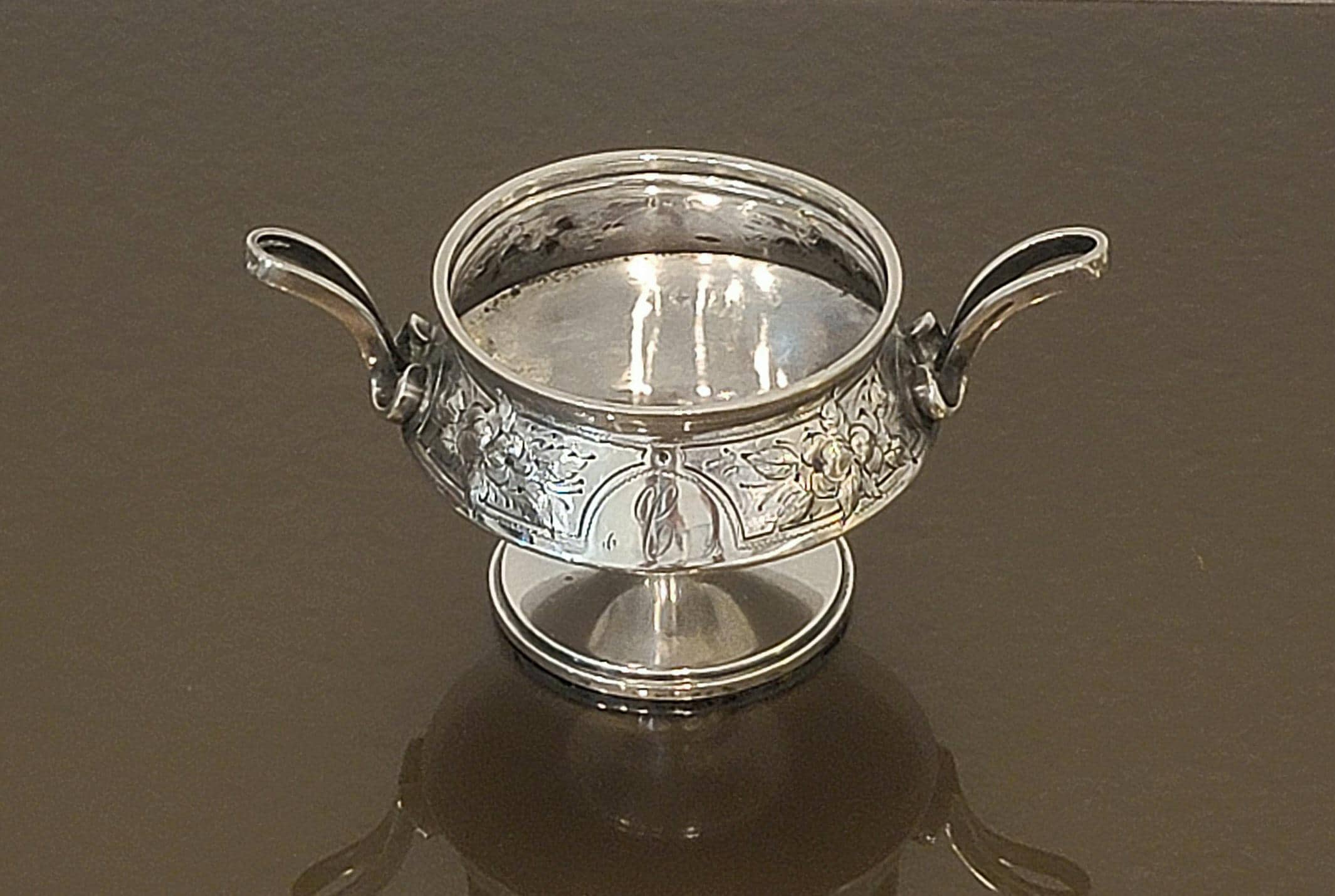 A beautifully crafted antique coin silver open salt cellar, featuring elegant hand-engraved floral decoration and a classic pedestal form with side handles.