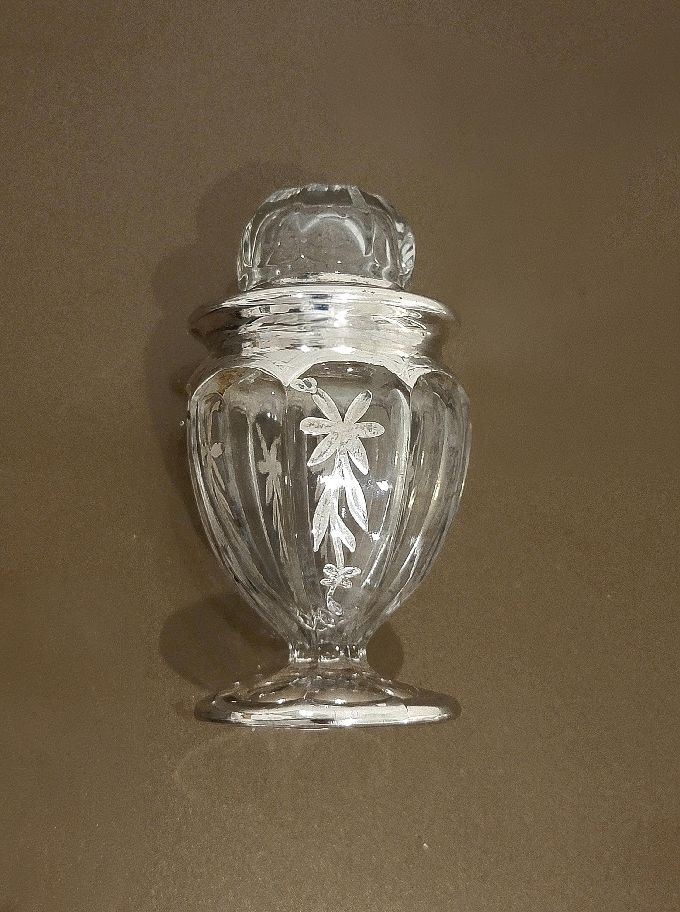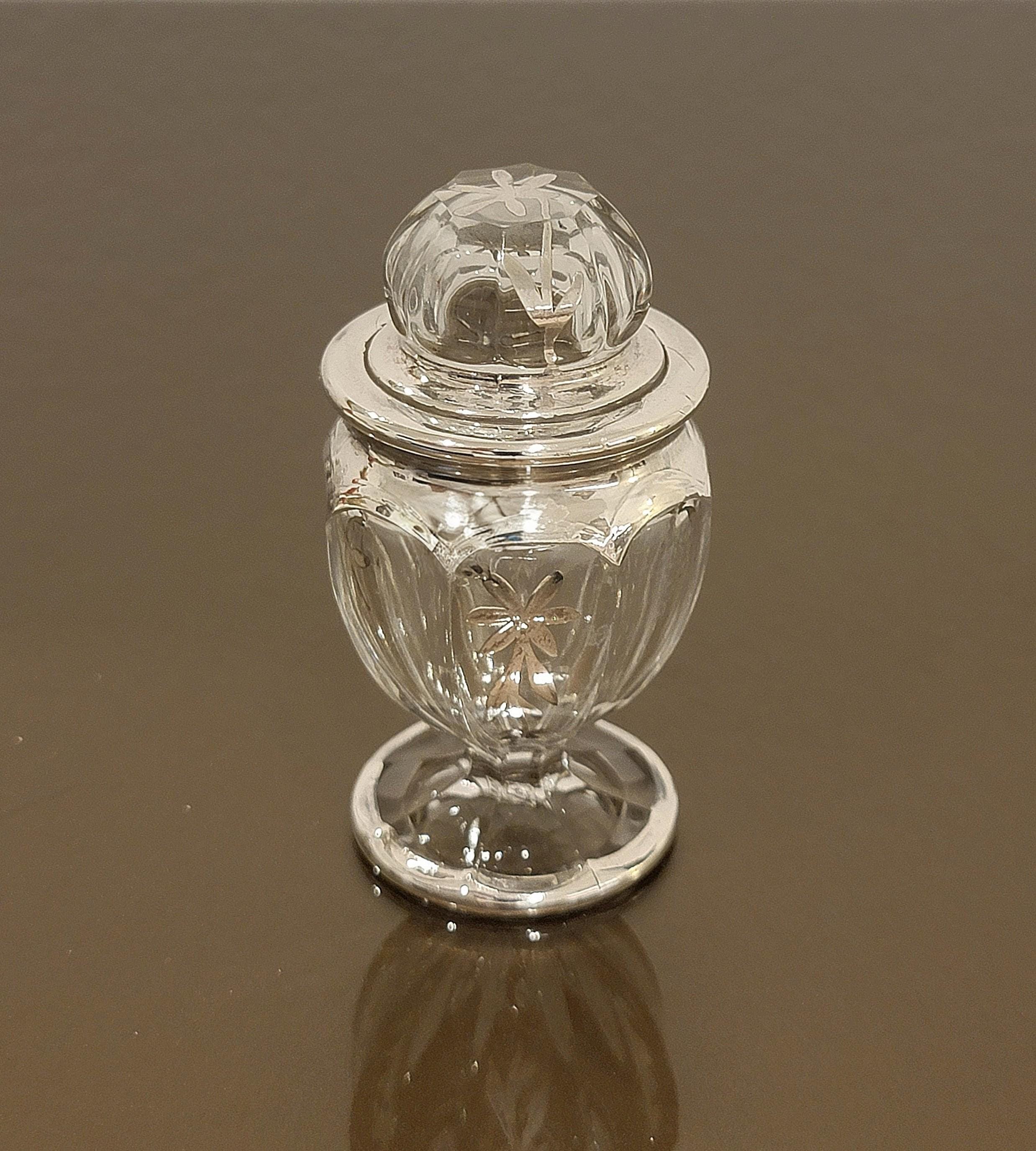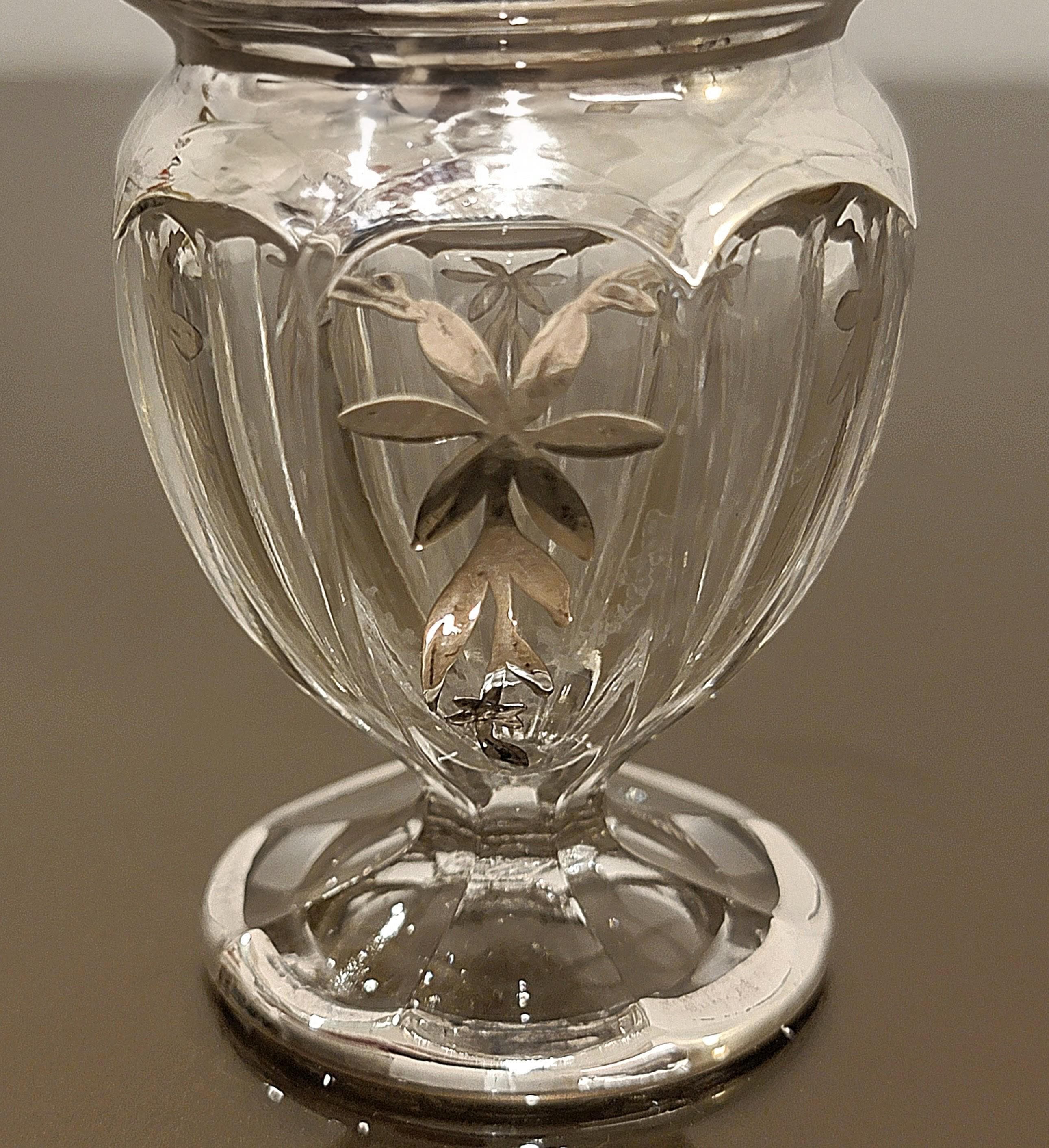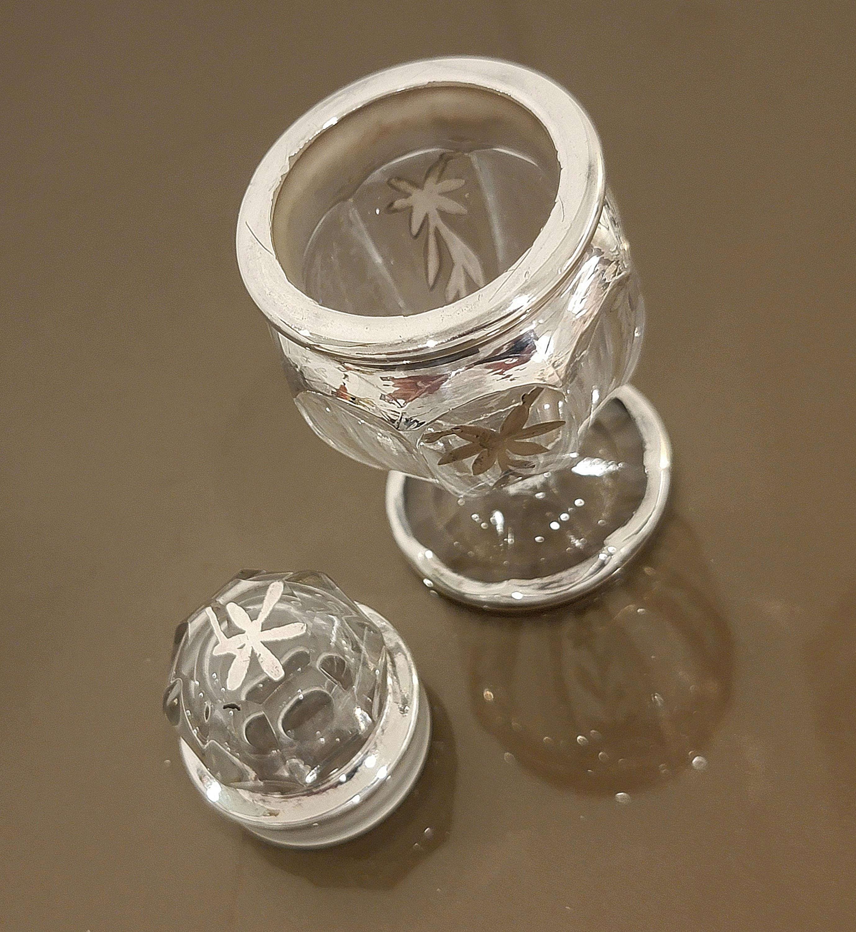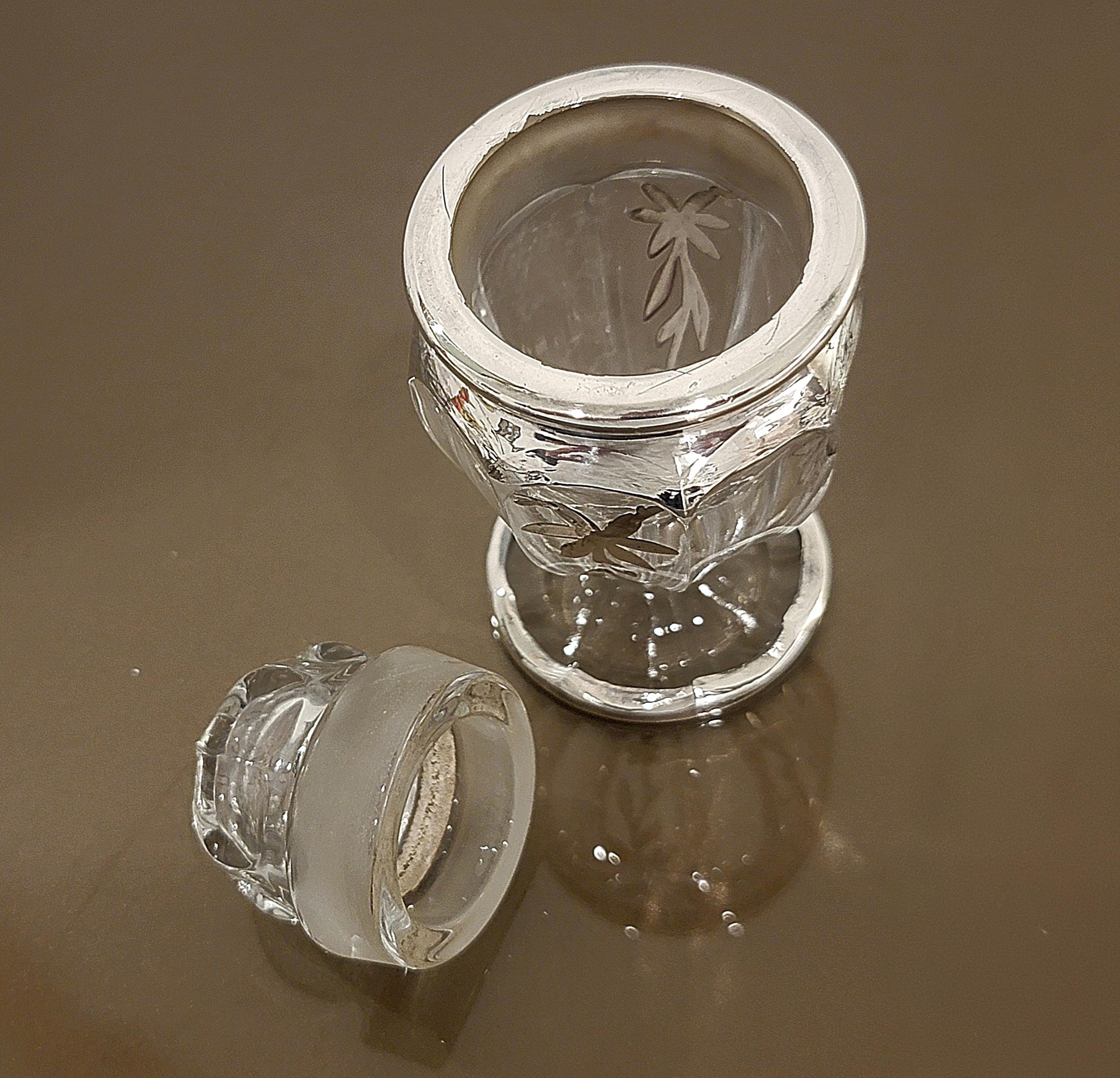 The sterling overlay collar adds a sophisticated contrast to the brilliance of the glass, making this a lovely display piece for a vanity, dressing table, or fine antique collection.