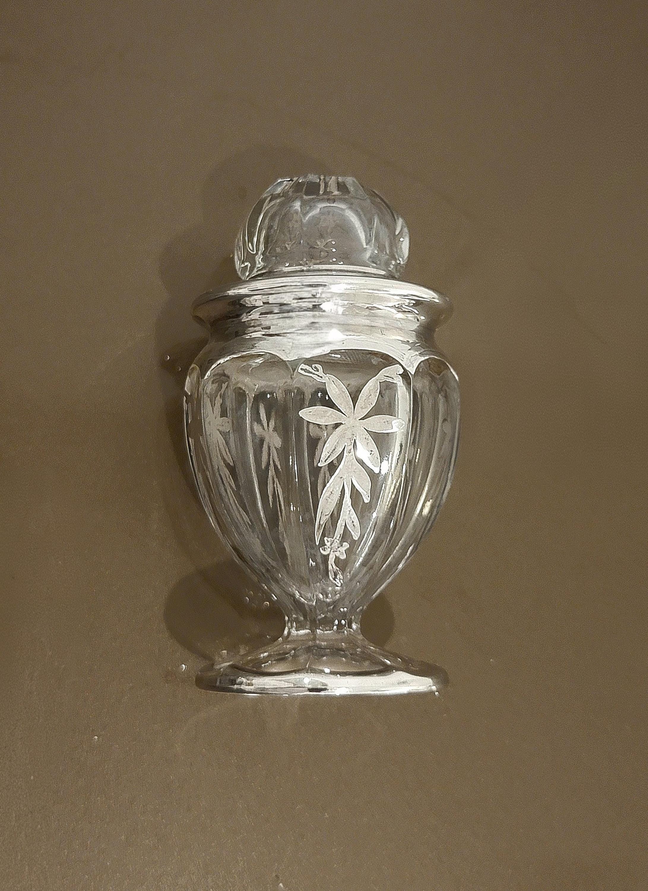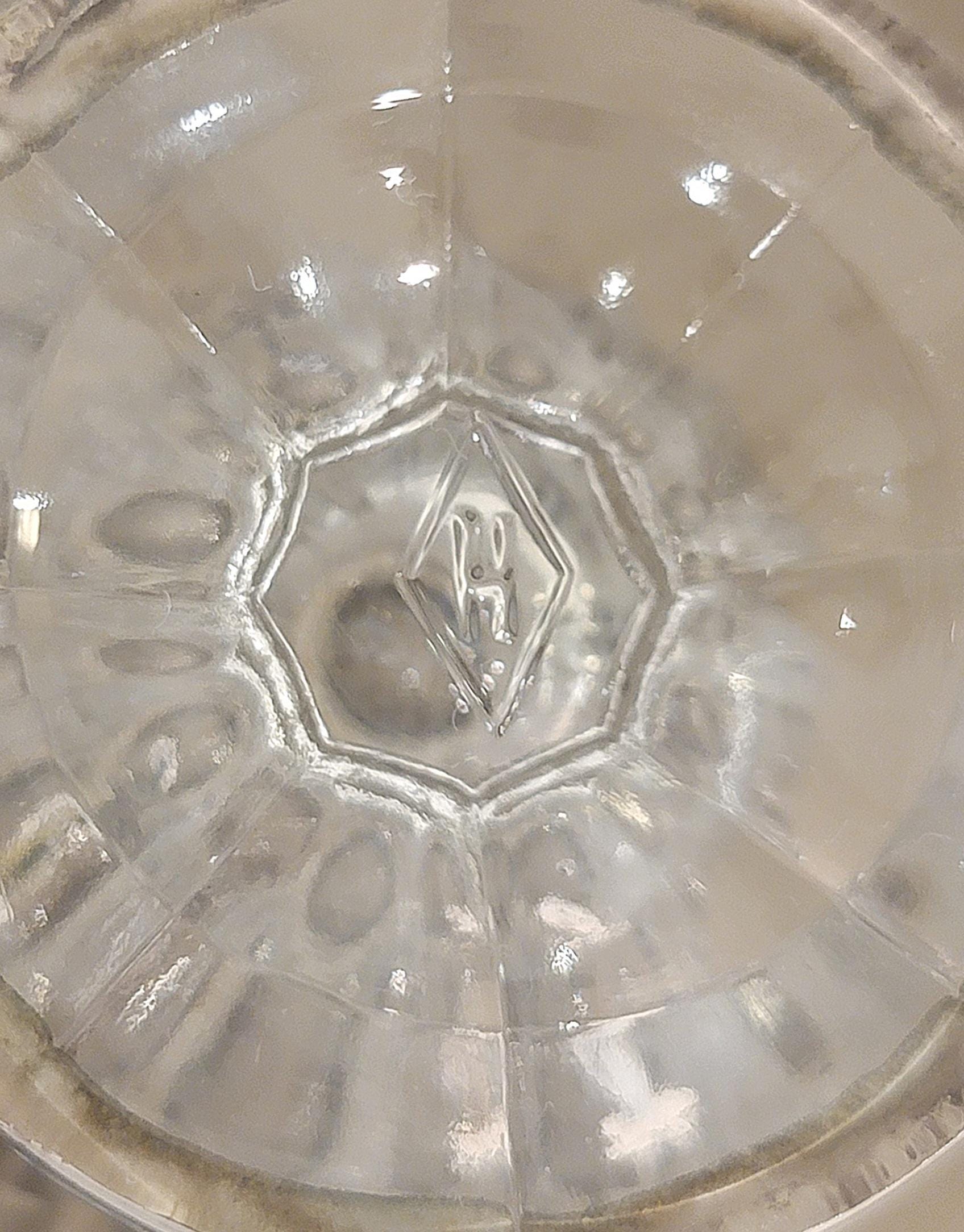 This charming piece showcases Heisey’s exceptional craftsmanship, with vertically paneled crystal accented by graceful hand-etched blossoms. The fitted stopper is faceted and repeats the floral motif, completing the refined design. The base is clearly marked with the iconic Heisey “H” in a diamond, confirming authenticity.