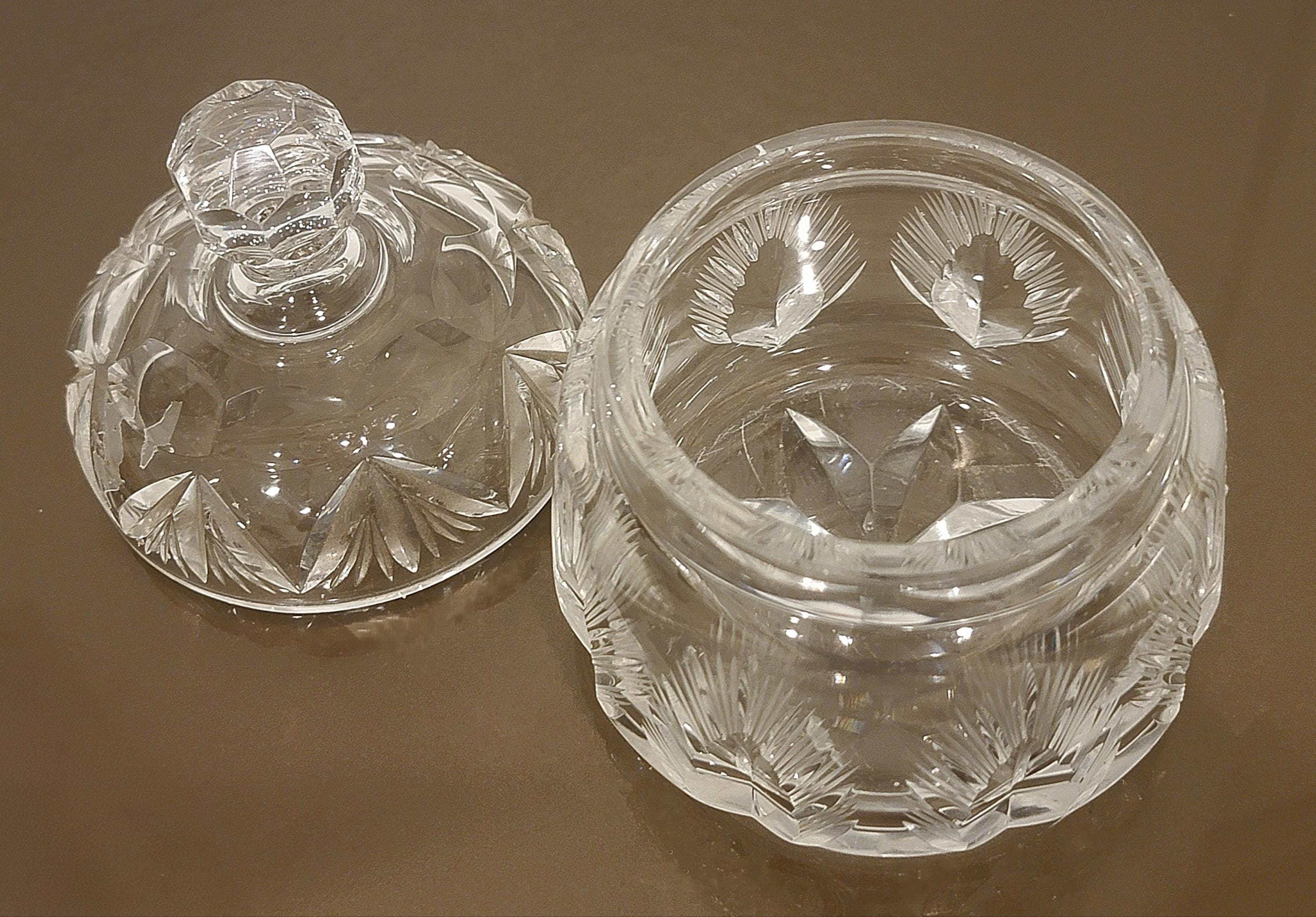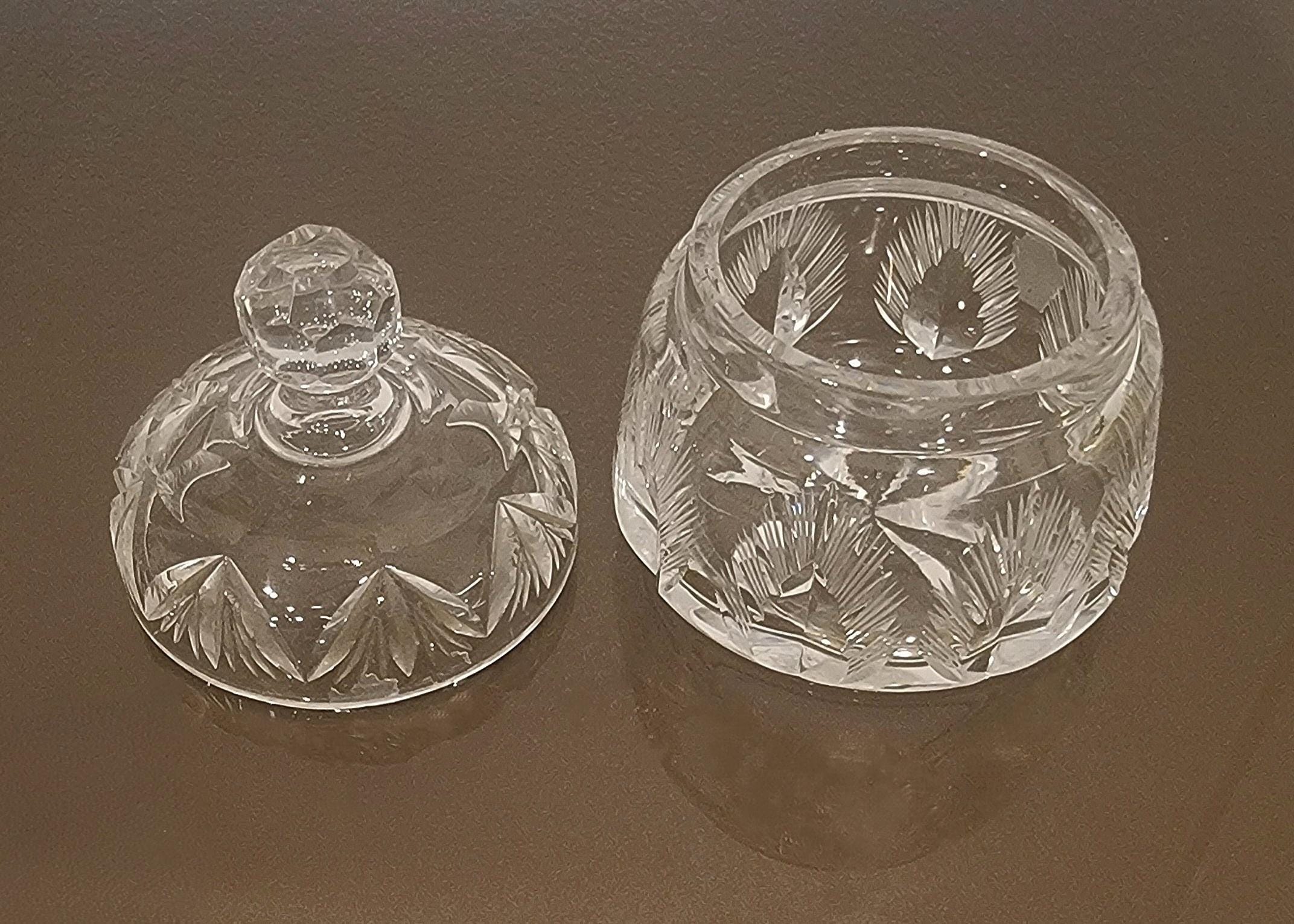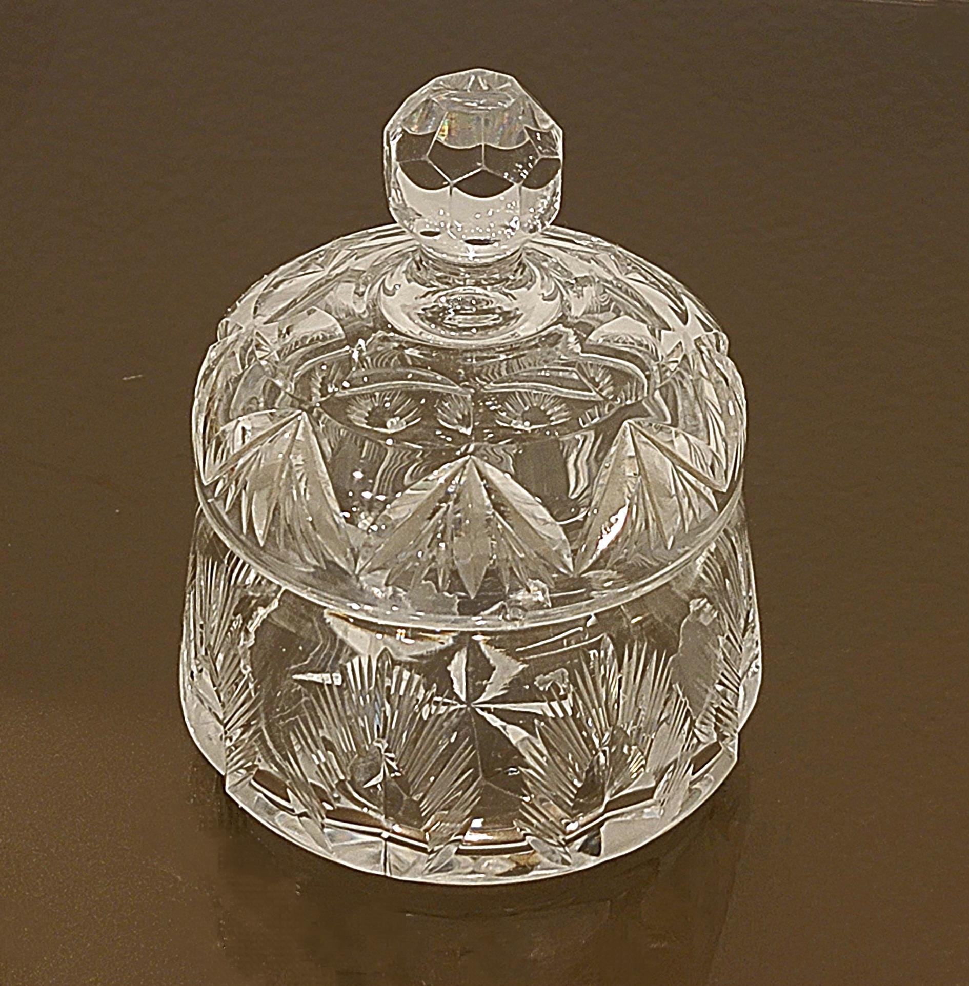 Add a touch of timeless elegance to your vanity or dresser with this beautifully hand-cut crystal lidded jar. Featuring a brilliant starburst and fan-cut pattern, this vintage piece sparkles from every angle and reflects light with exceptional clarity.