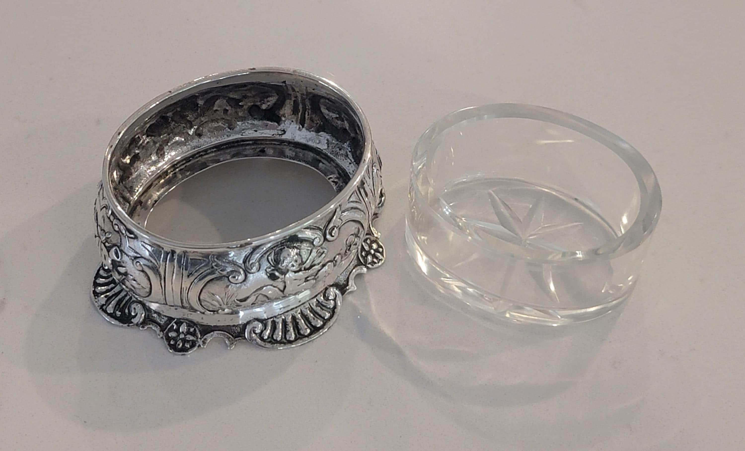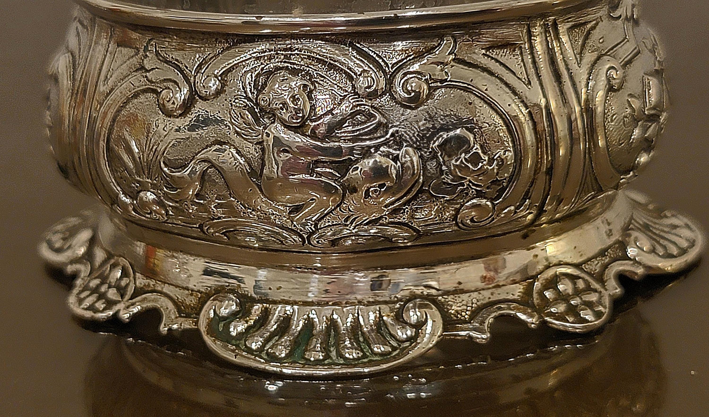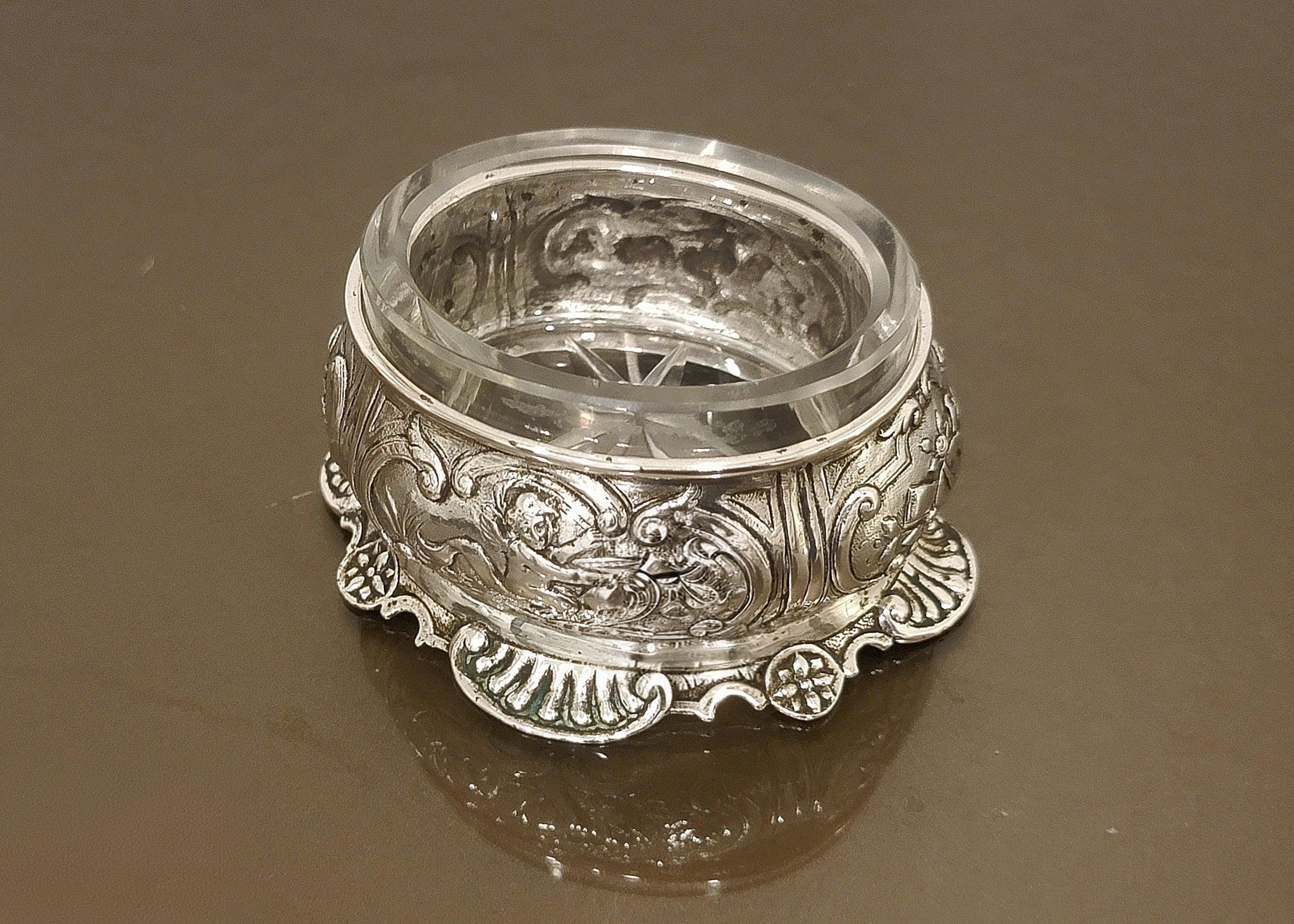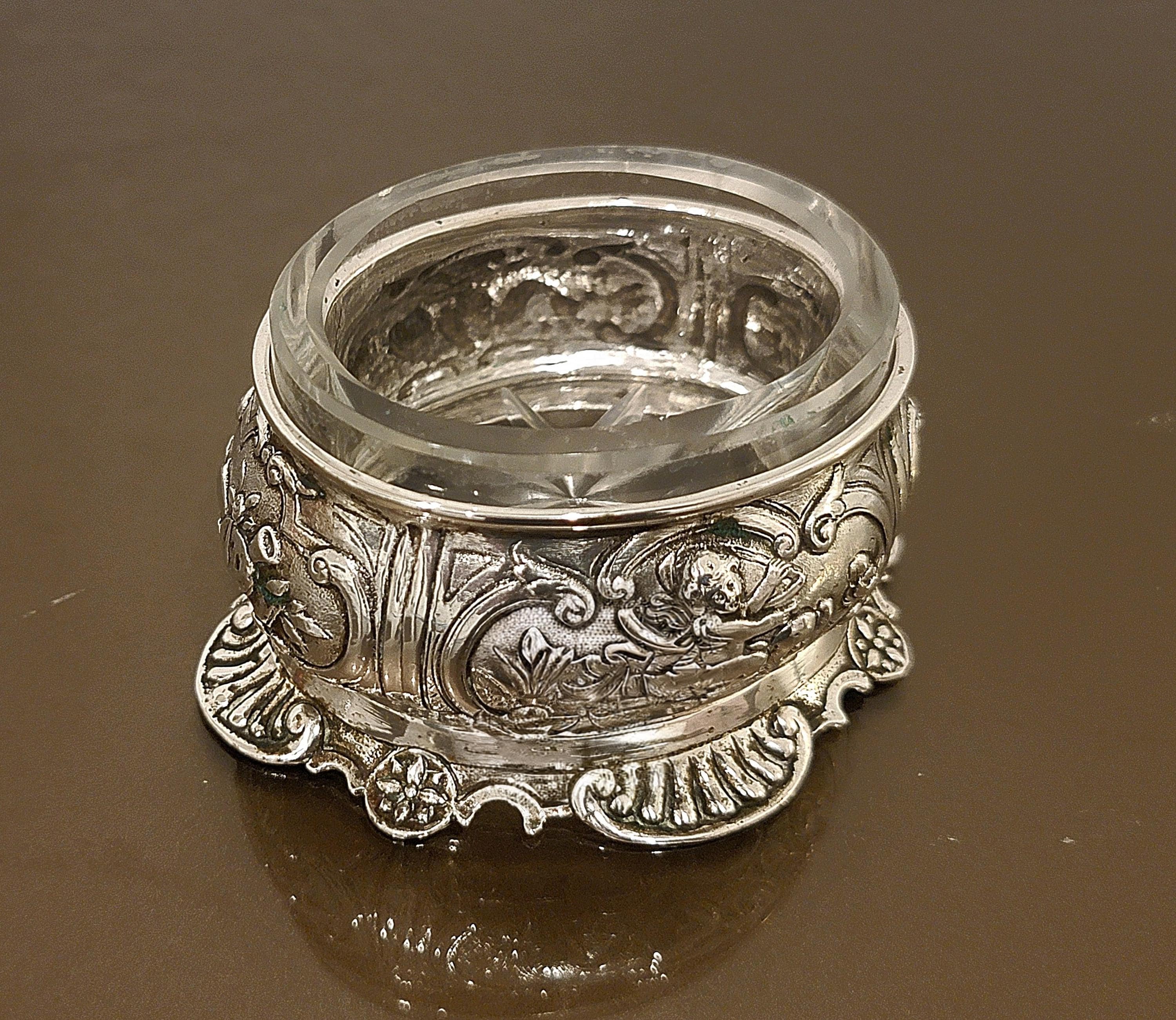 Add a refined touch of antique elegance to your table with this exceptional European 900 silver salt cellar, richly decorated with detailed cherub (putti) repoussé work and flowing Rococo-style ornamentation.