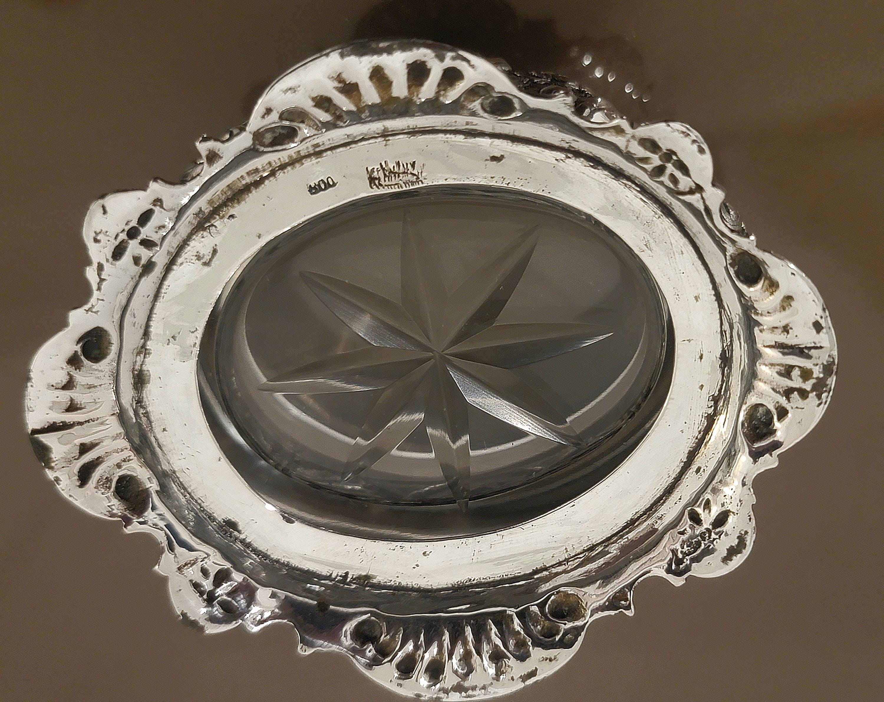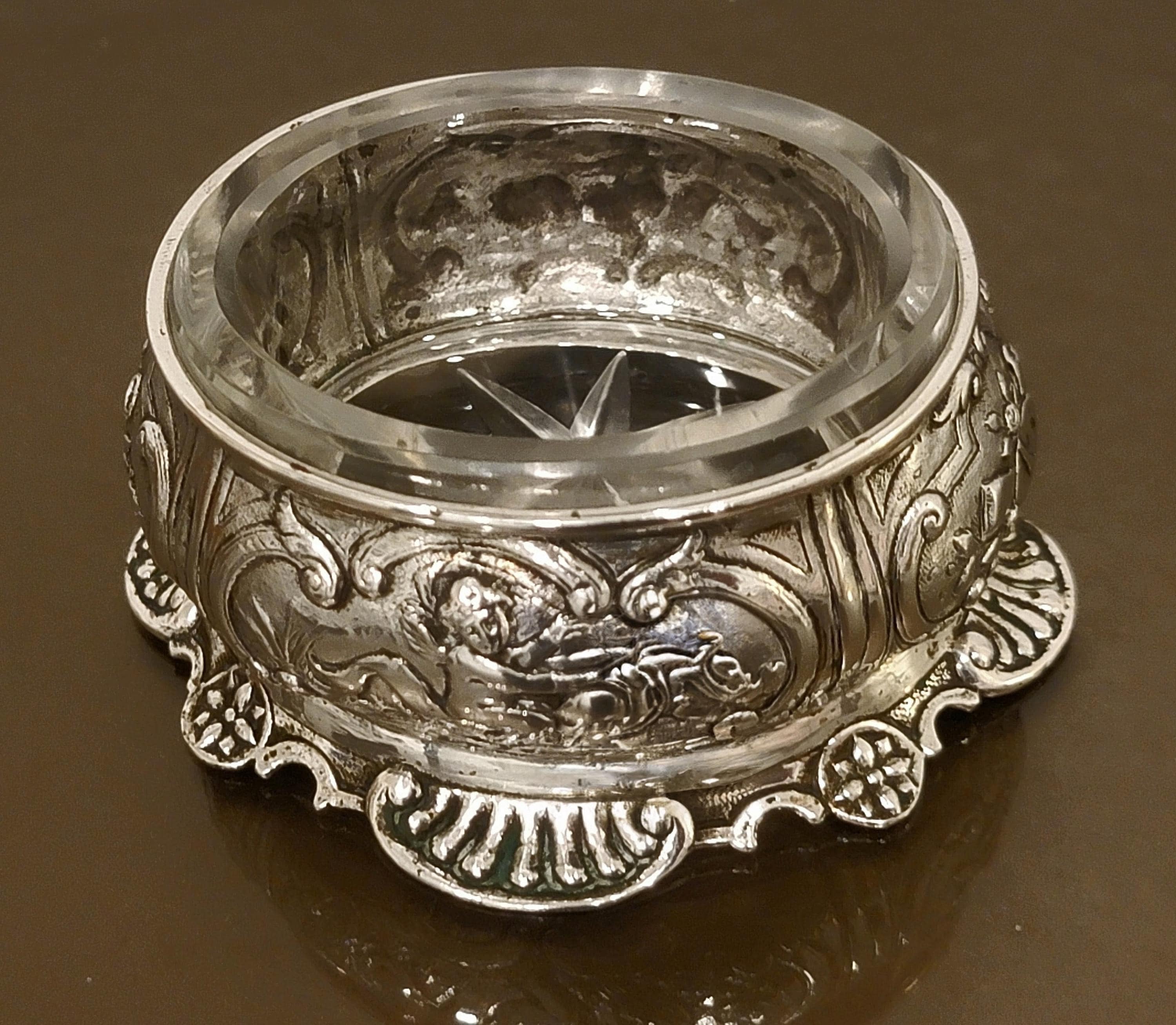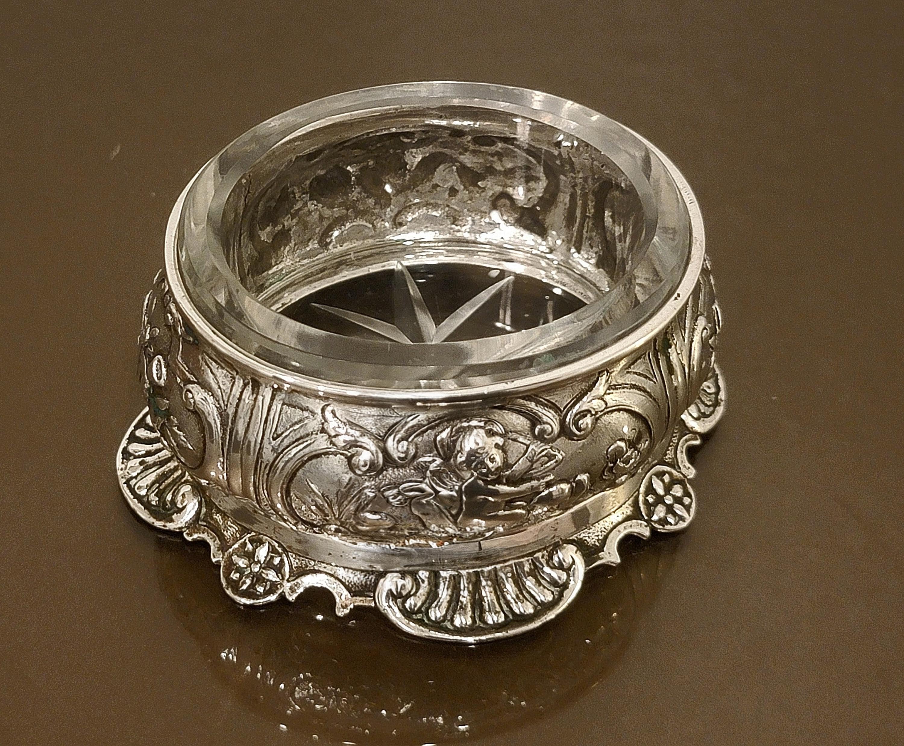 This piece retains its original thick cut glass liner, featuring a starburst-cut base that beautifully reflects light. The combination of high-grade silver and intricate figural design makes this both a functional table piece and a highly decorative collectible.