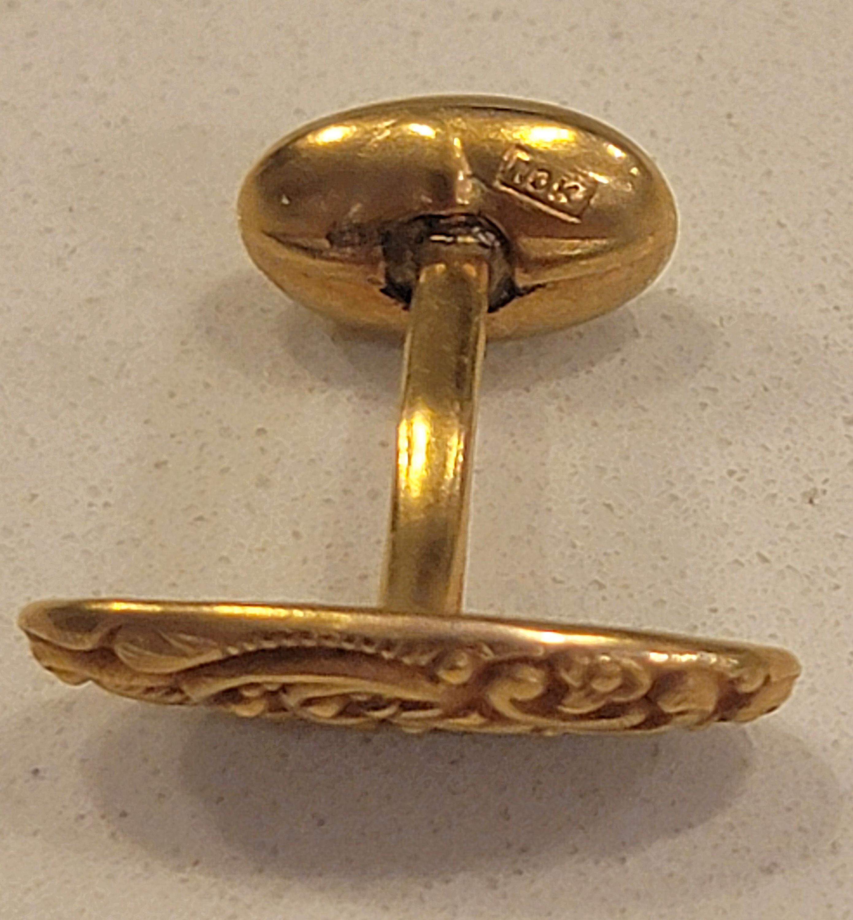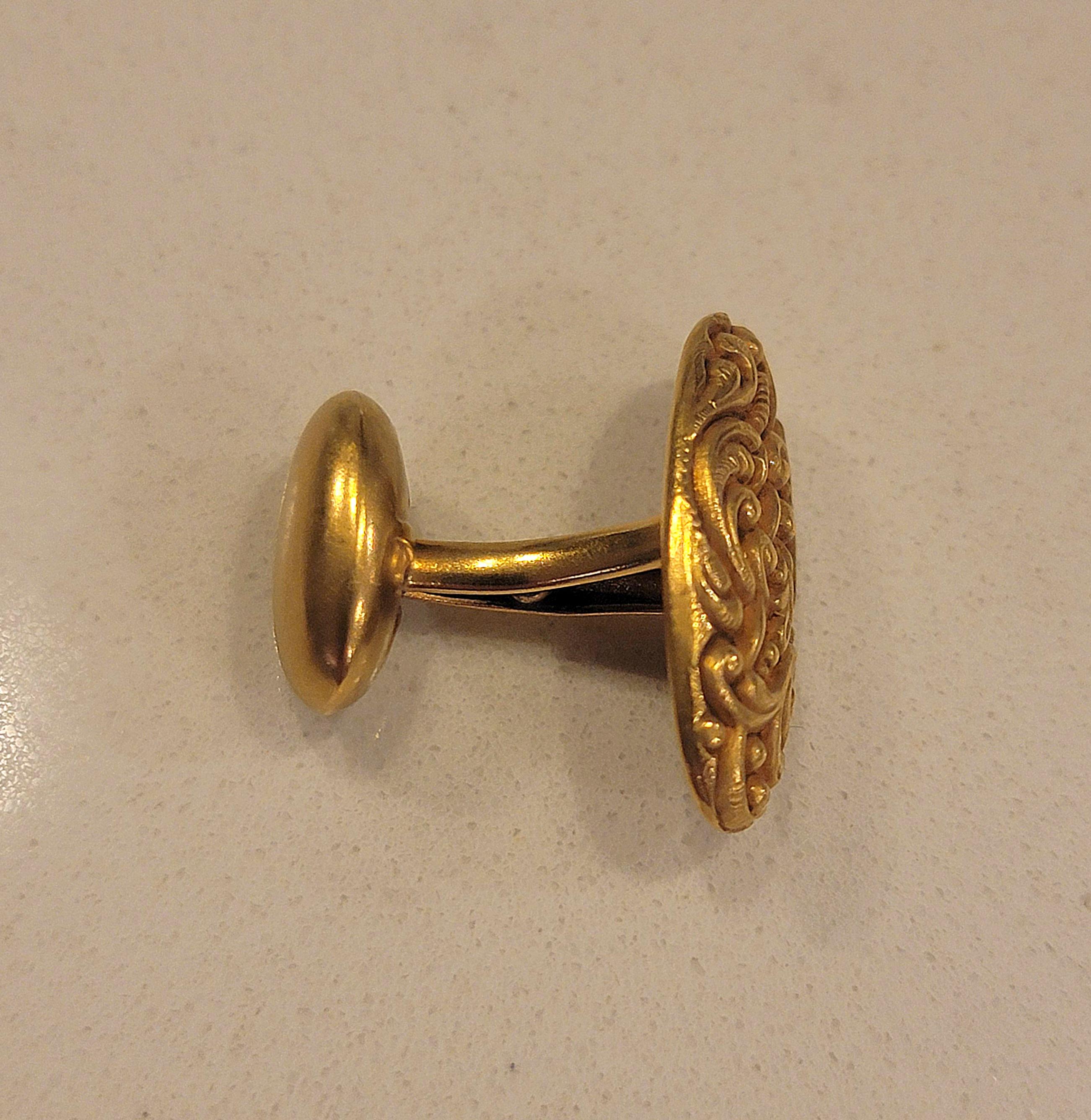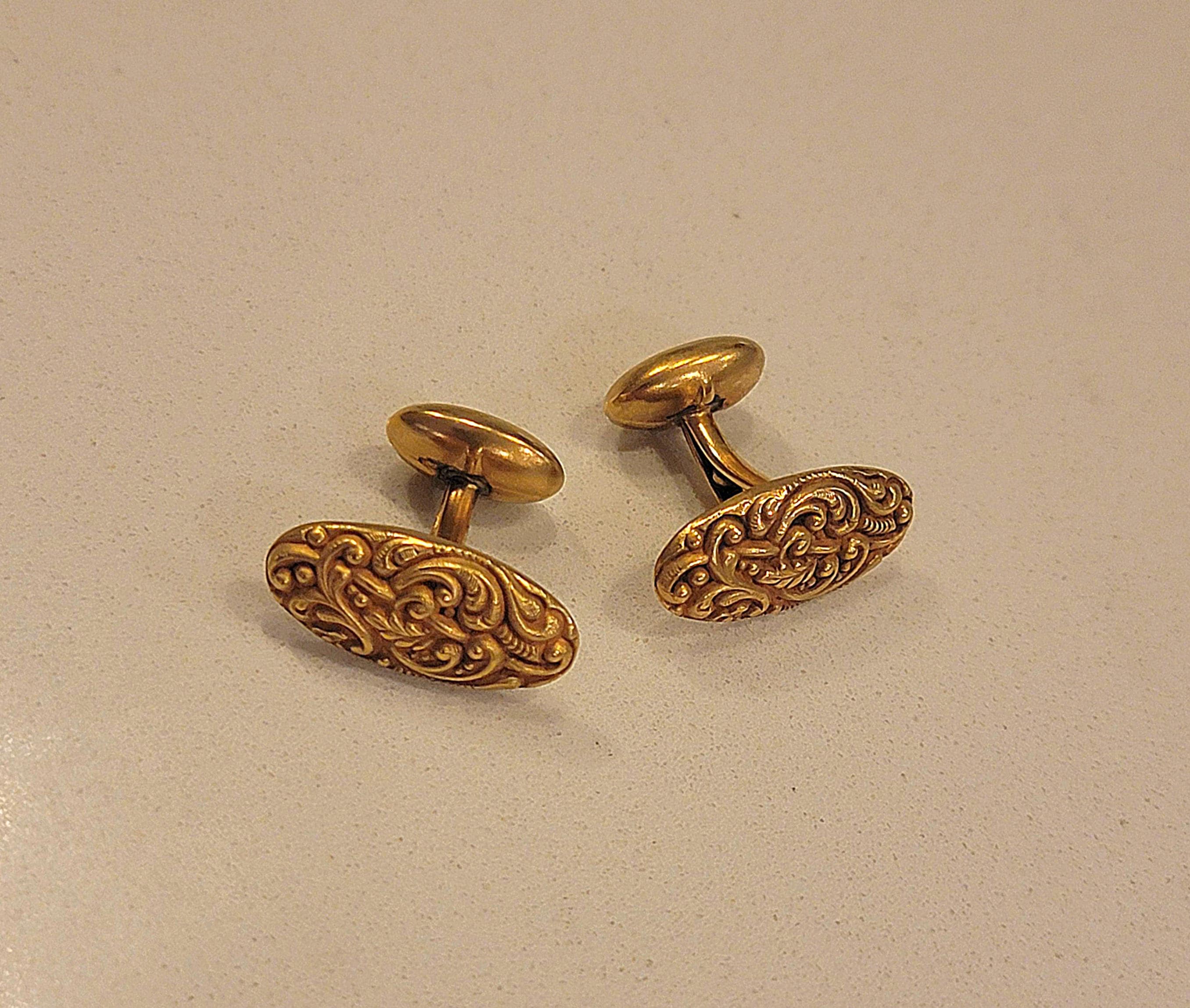 Add a touch of timeless elegance to your formal wear with this refined pair of vintage 10K gold cufflinks. Featuring a beautifully engraved scrolling motif, these cufflinks offer understated sophistication with a warm, rich gold tone that complements any dress shirt.