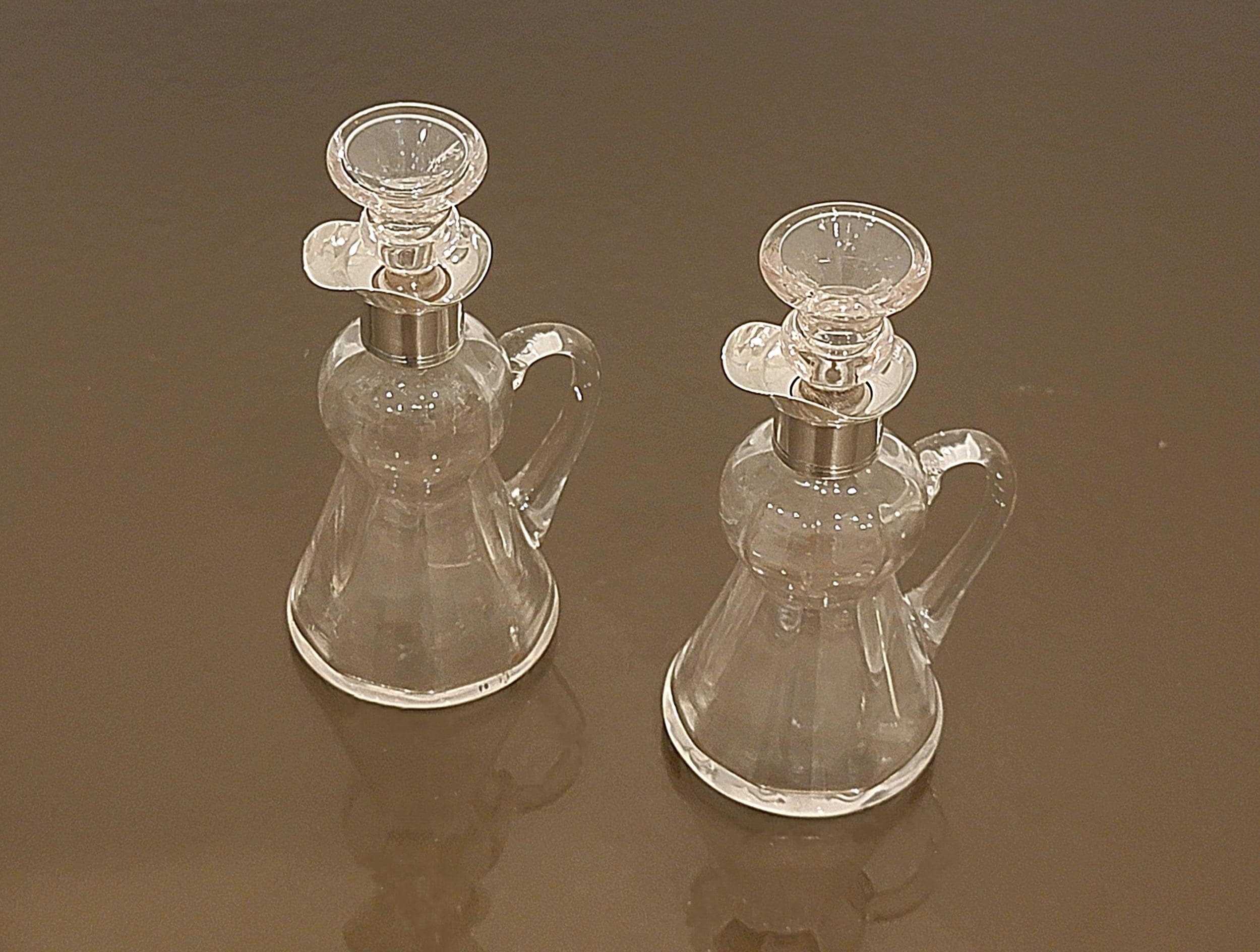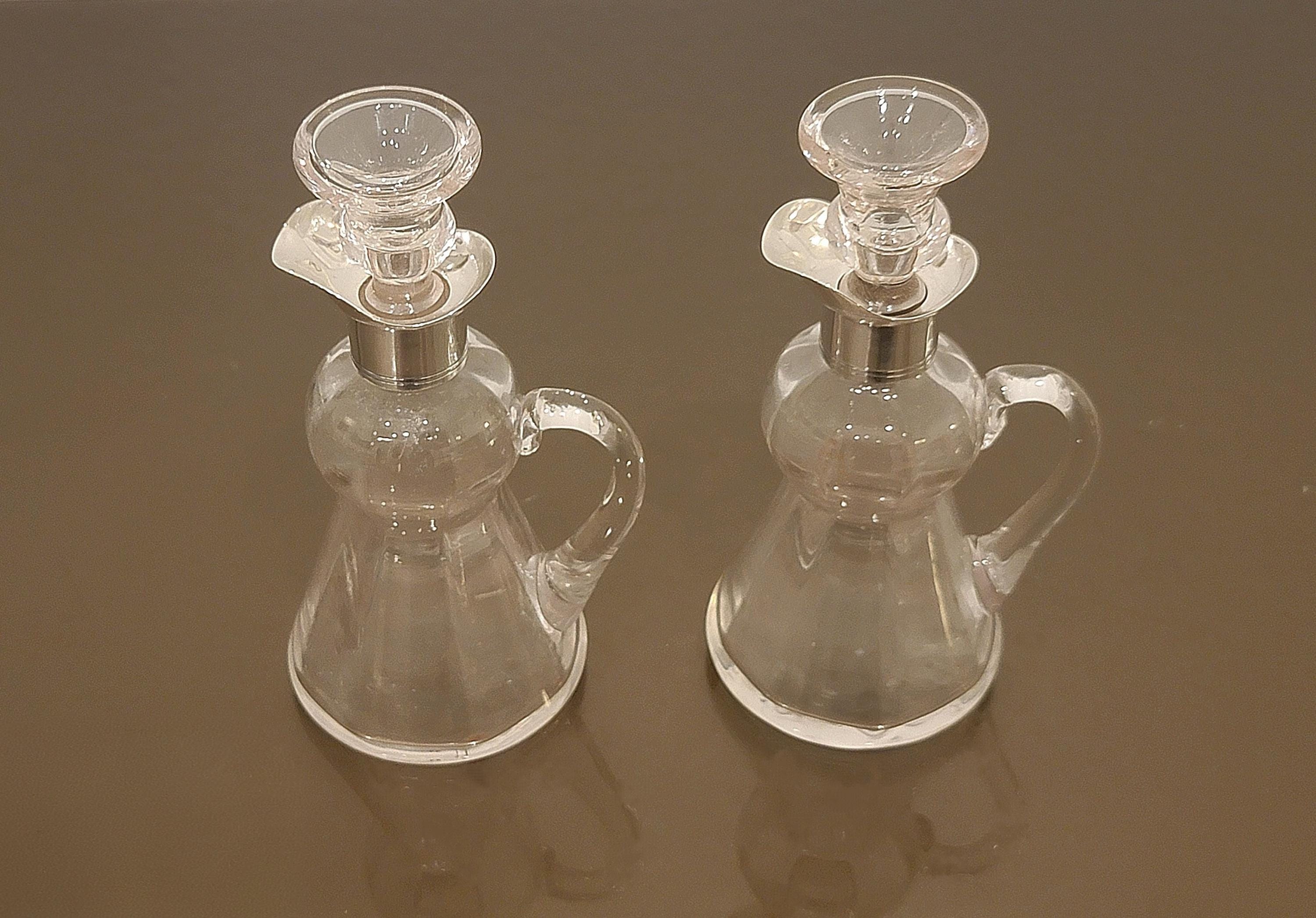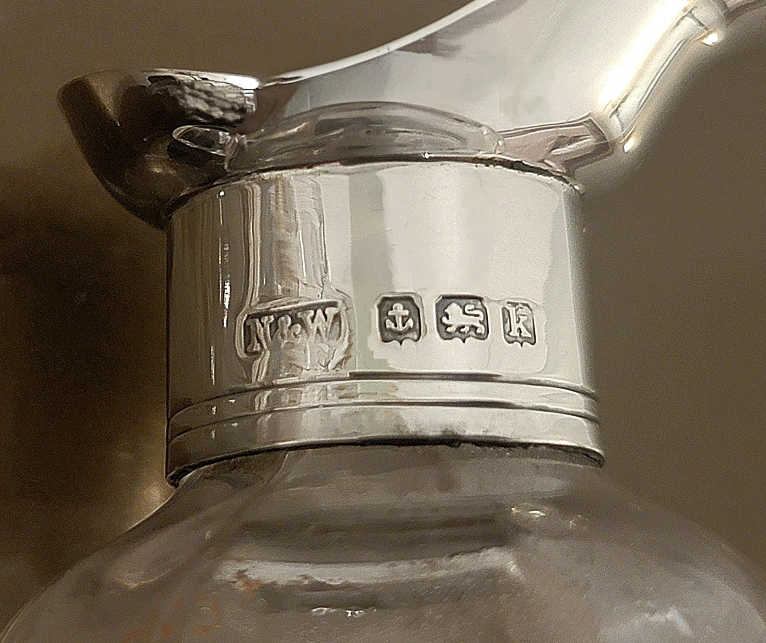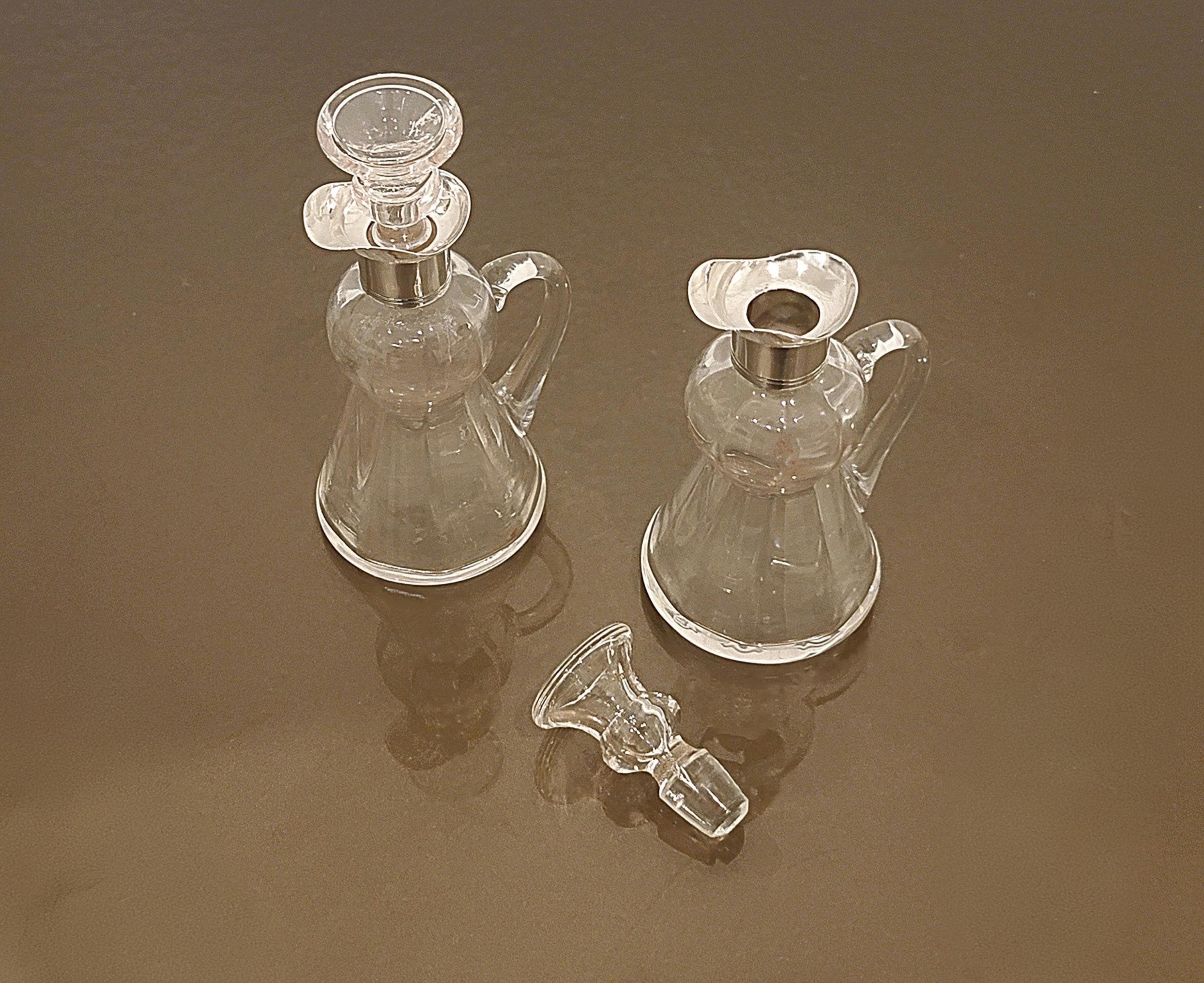Each bottle features a gracefully proportioned hand-blown crystal body fitted with a finely worked sterling silver collar and pouring lip, fully hallmarked with: