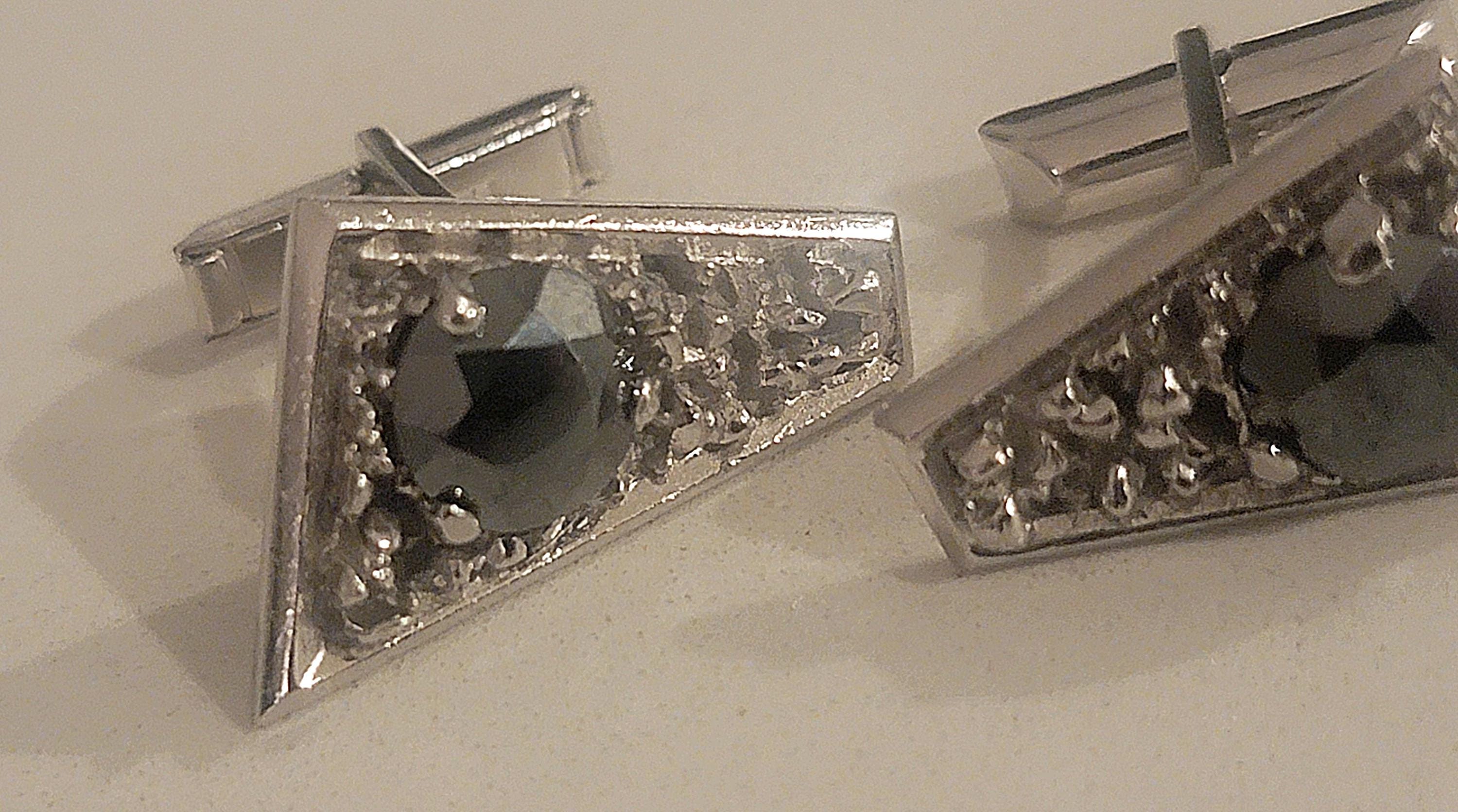 Striking and sculptural, this pair of vintage sterling silver cufflinks showcases a bold mid-century modern design with a distinctly brutalist influence. Each cufflink features a faceted black stone set into a textured, asymmetrical triangular frame, creating a look that is both rugged and refined.