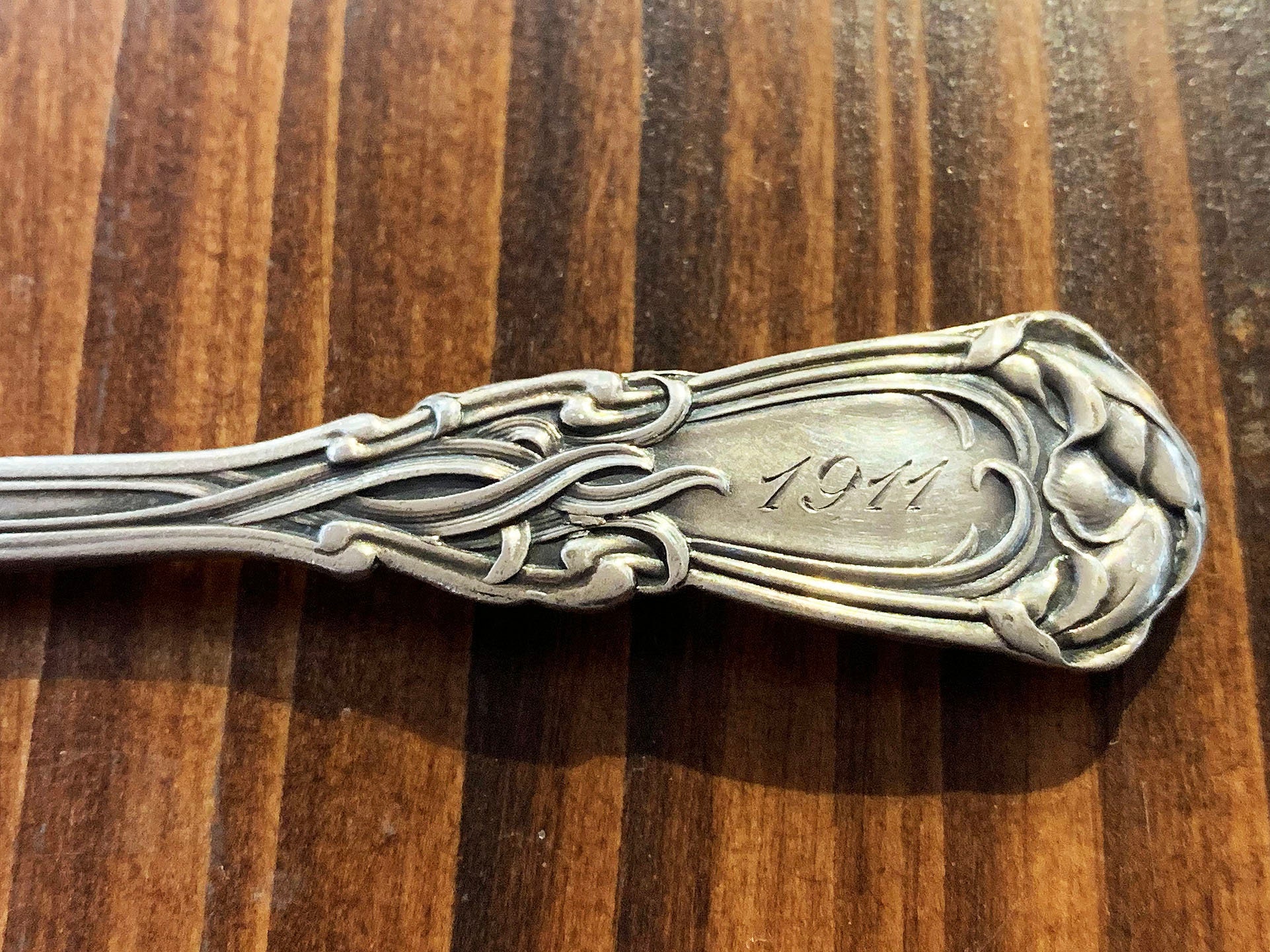 1) Gold spoon with a silver handle. Monogrammed "1911" on the inner handle and "R" on the outer handle.
