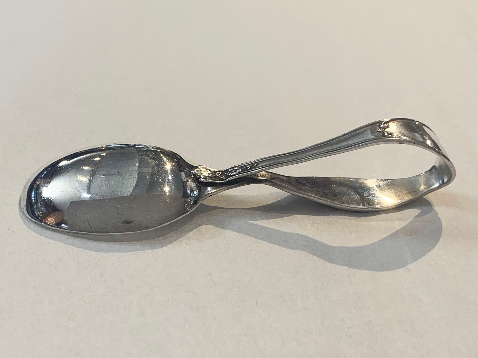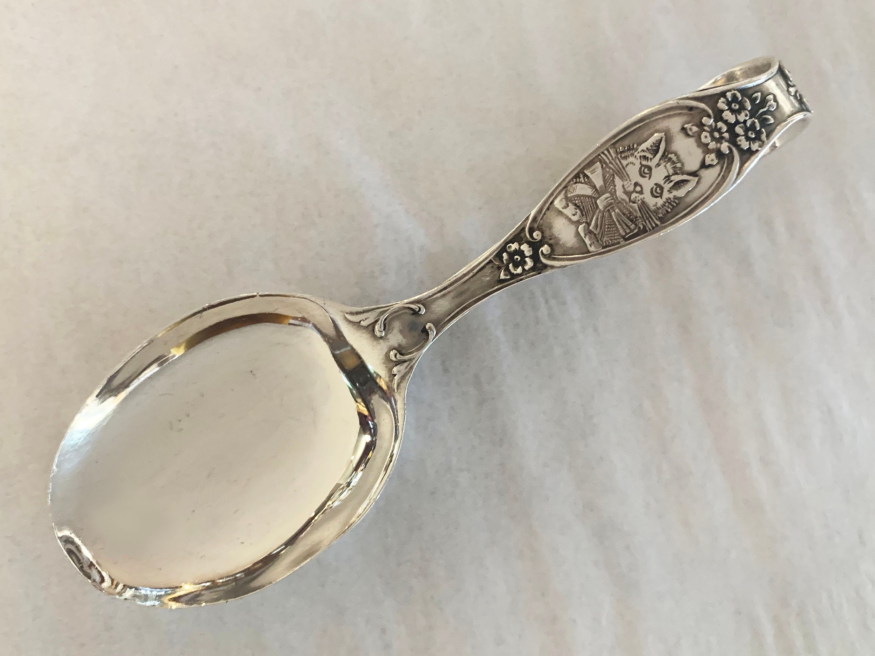 Give the gift that becomes an heirloom with this darling antique piece. Crafted by R. Blackinton in the late 1800's, this rare sterling silver baby spoon depicting a cat wearing a bow makes the perfect gift for any baby shower, christening, gender reveal or birthday party.