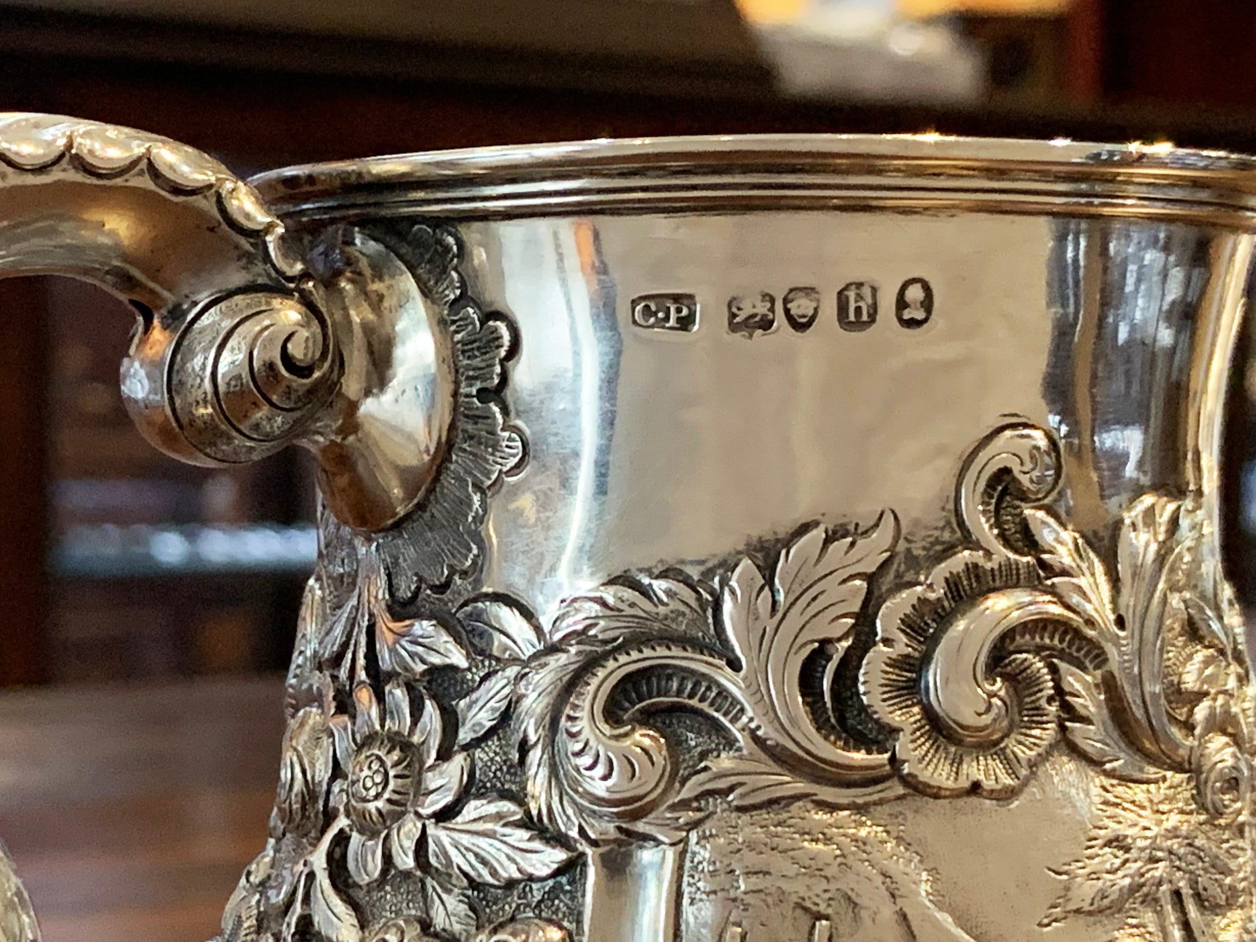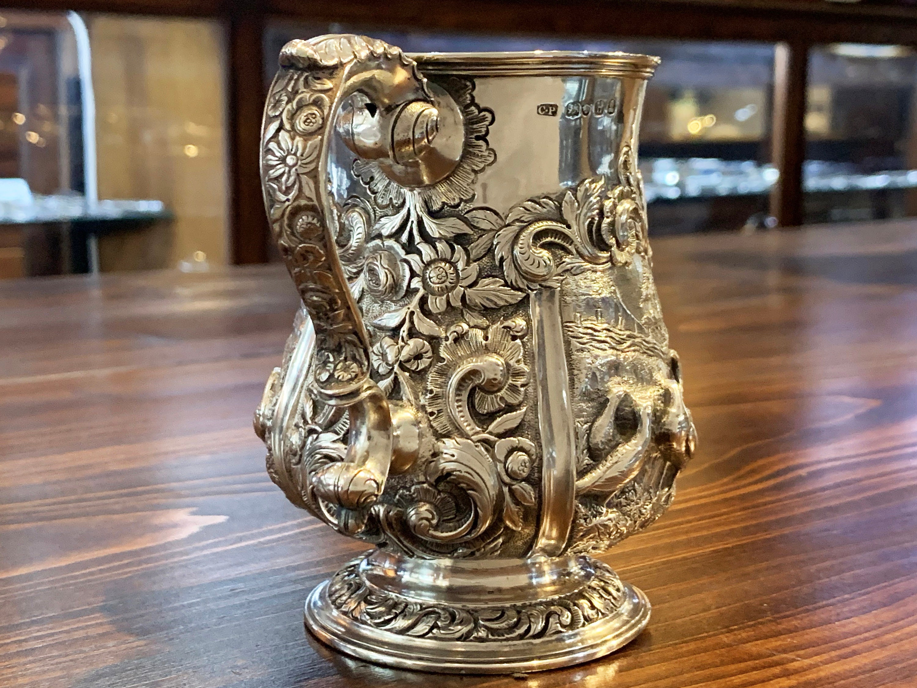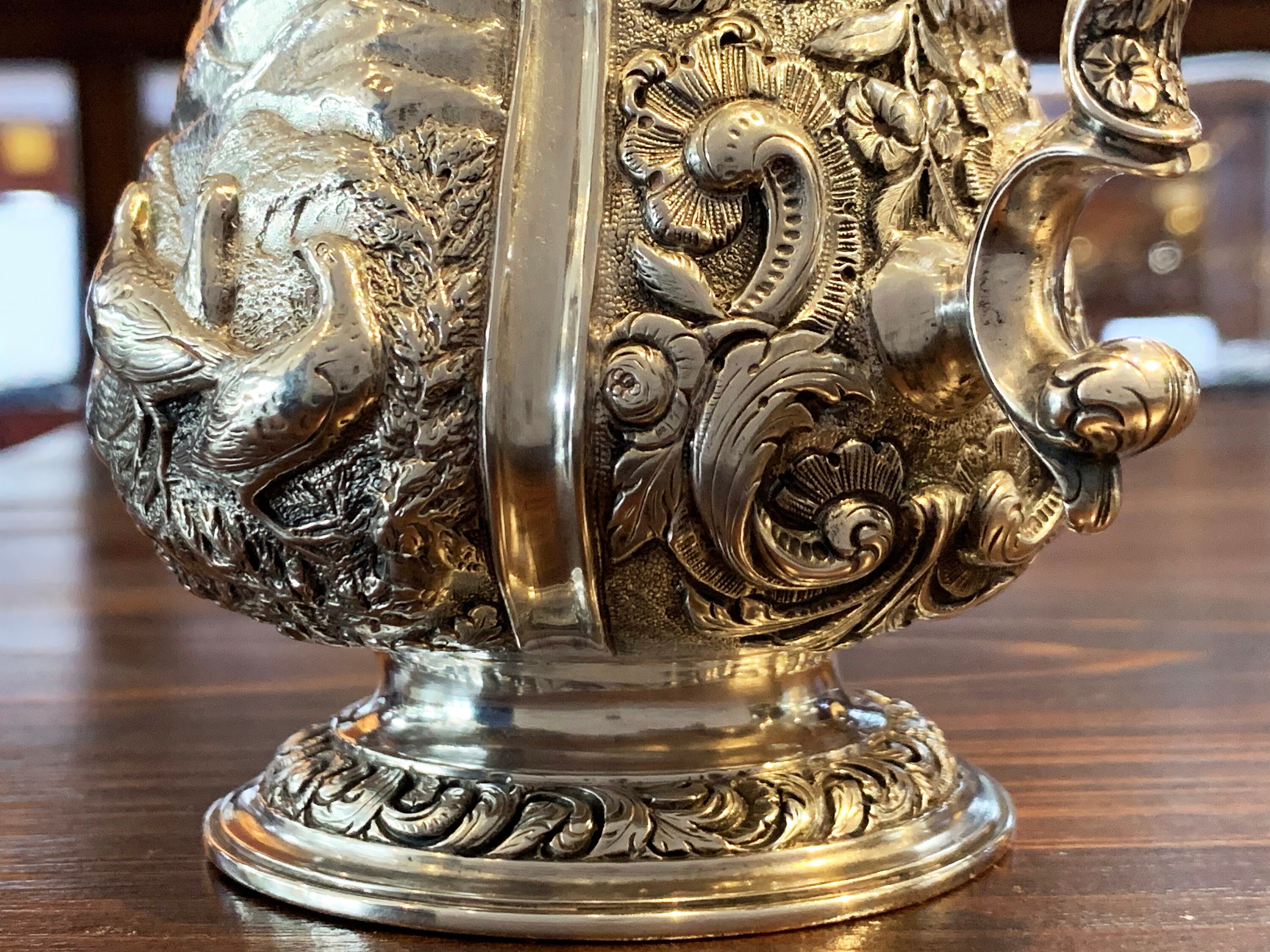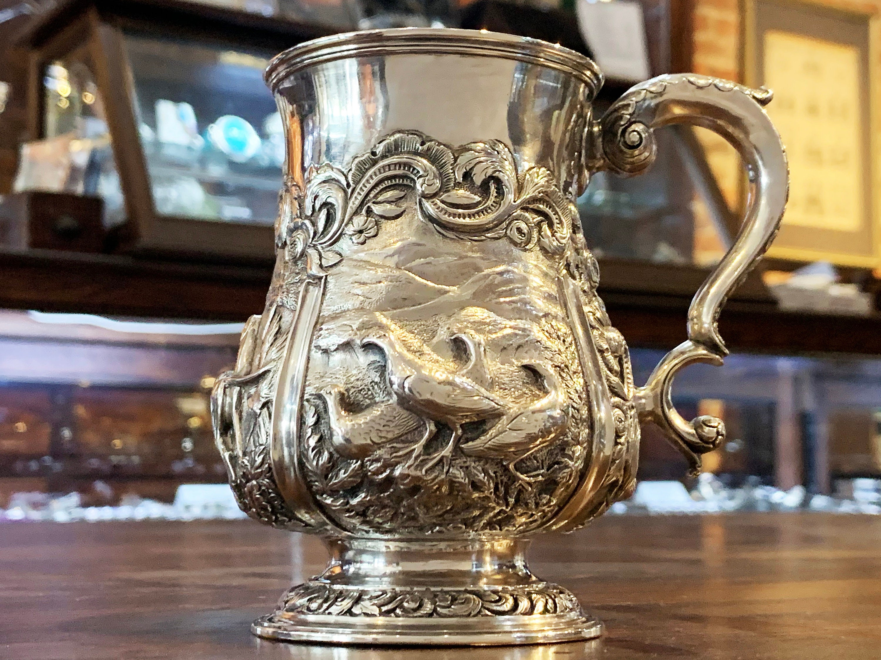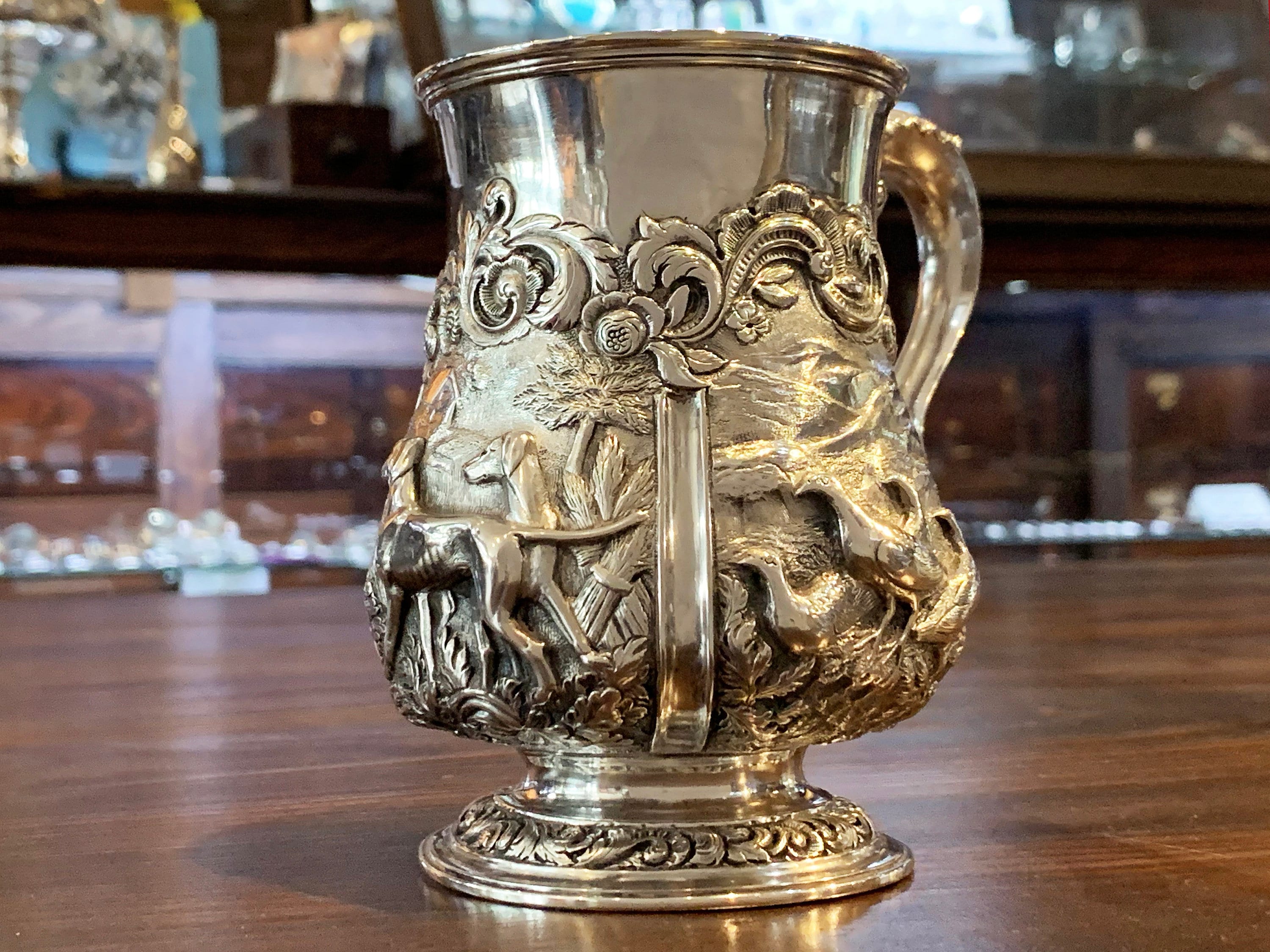 Serve in style with this stunning sterling silver cann. Designed in London in 1903, this piece features an elaborate hunting scene depicting pheasants and dogs in the countryside. This antique gem is sure to become a treasured heirloom. For easy tarnish preventative storage, add https://www.etsy.com/listing/779223480.