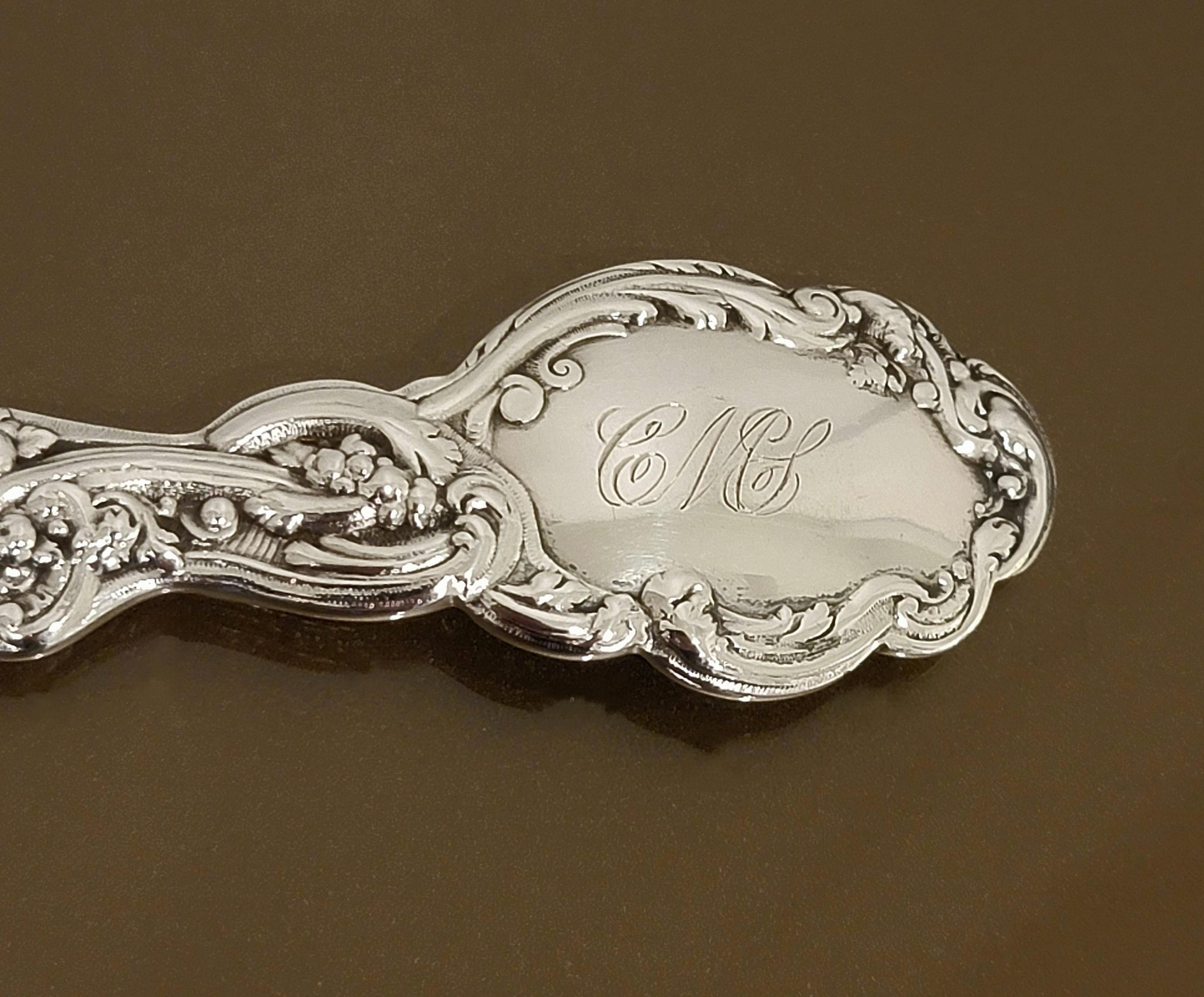 Versailles is one of the most highly collectible intricate silver patterns made by Gorham in 1888. The rear of handle is engraved "CMS" and the light gold wash in the bowls add glimmer and class to this rare set. For easy tarnish preventative storage, add 2 of www.etsy.com/listing/782095460.