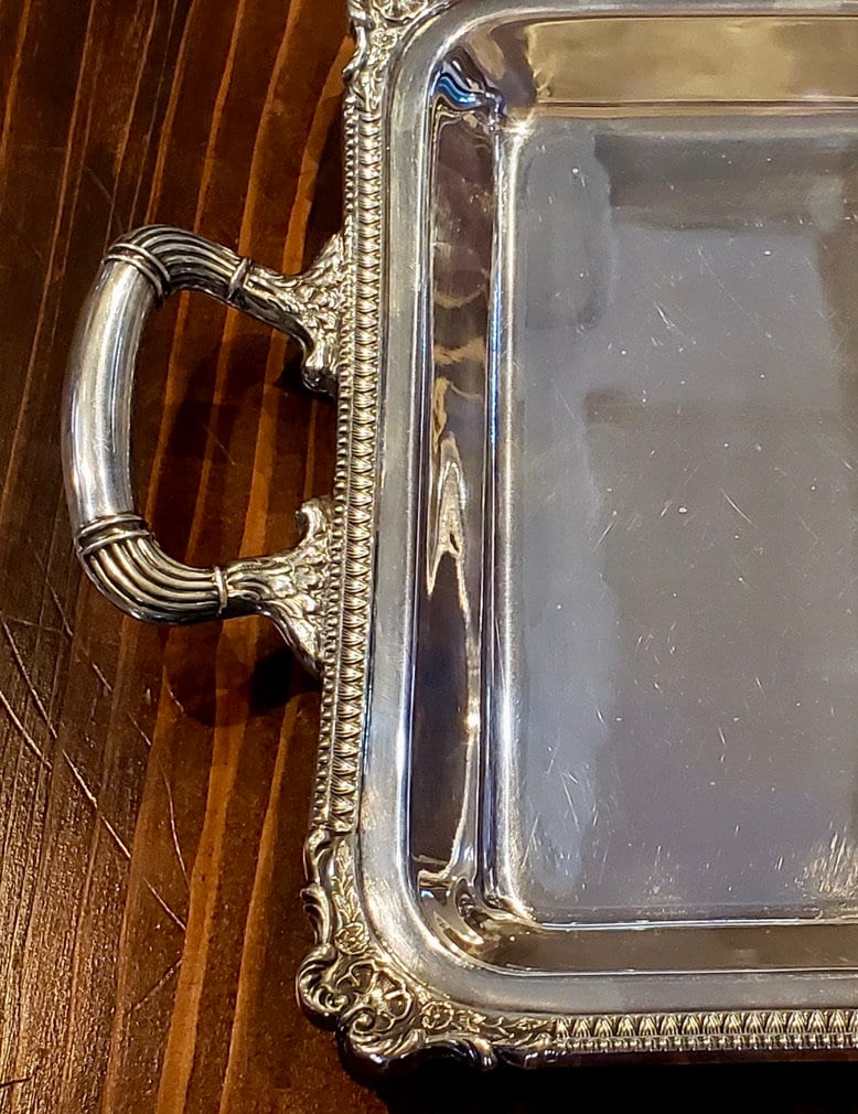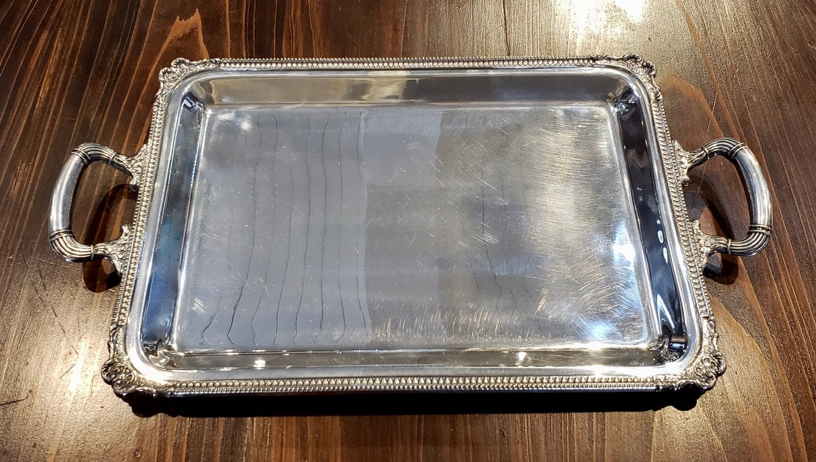 A Peruvian rectangular tray with handles made by the famously known silversmith, Camusso. For easy tarnish preventative storage, add https://www.etsy.com/AsYouLikeItSilver/listing/795971253.
