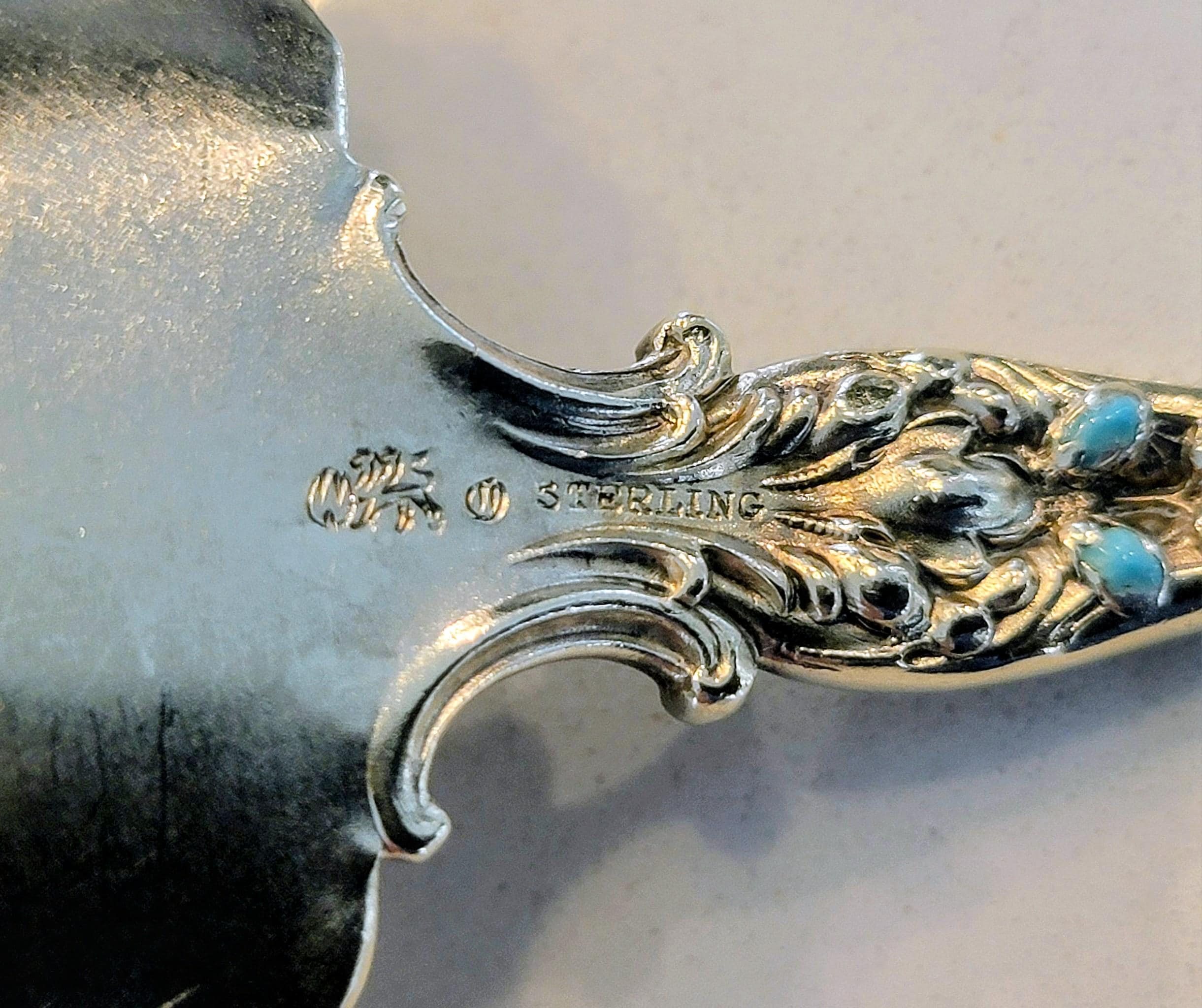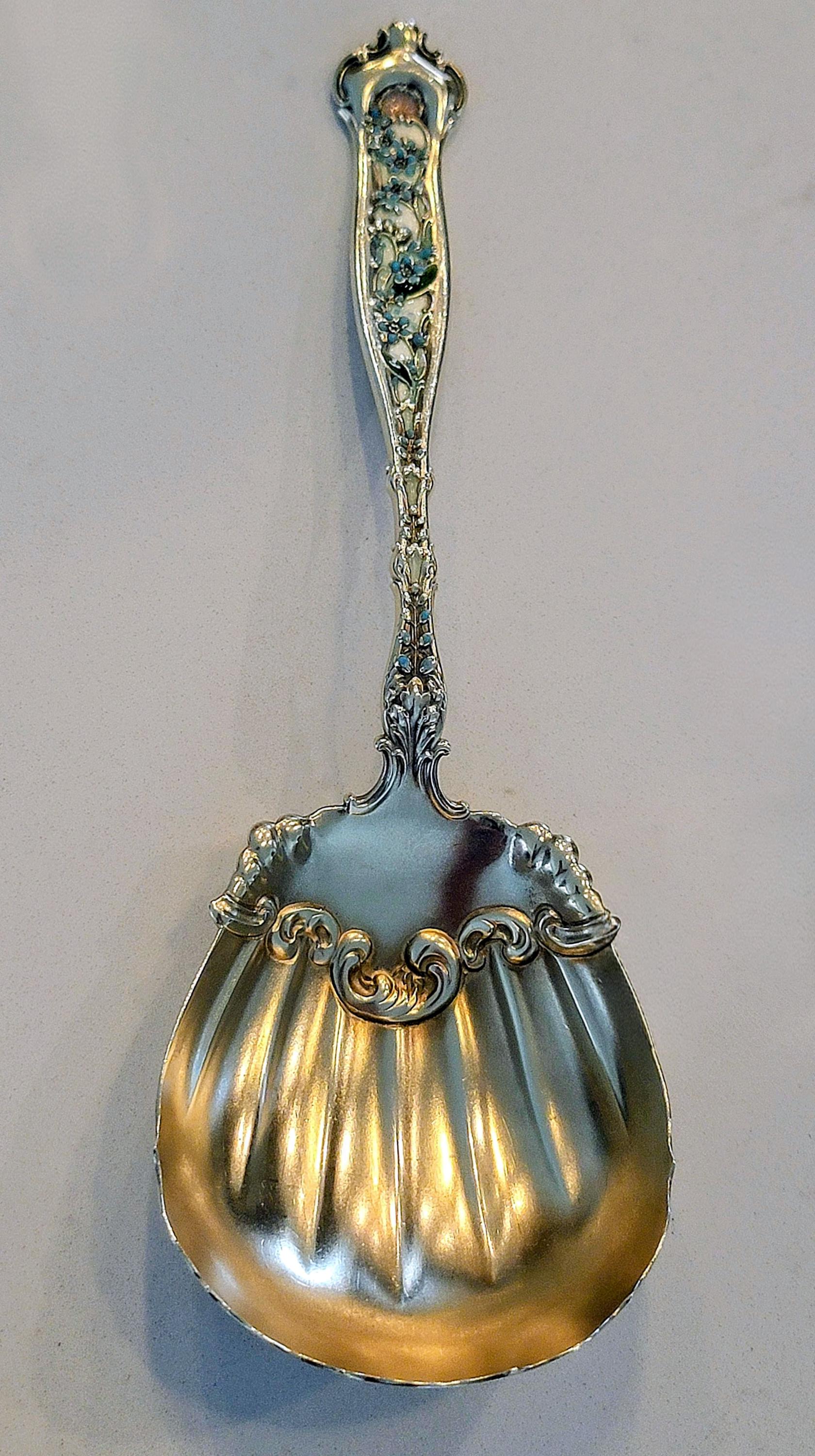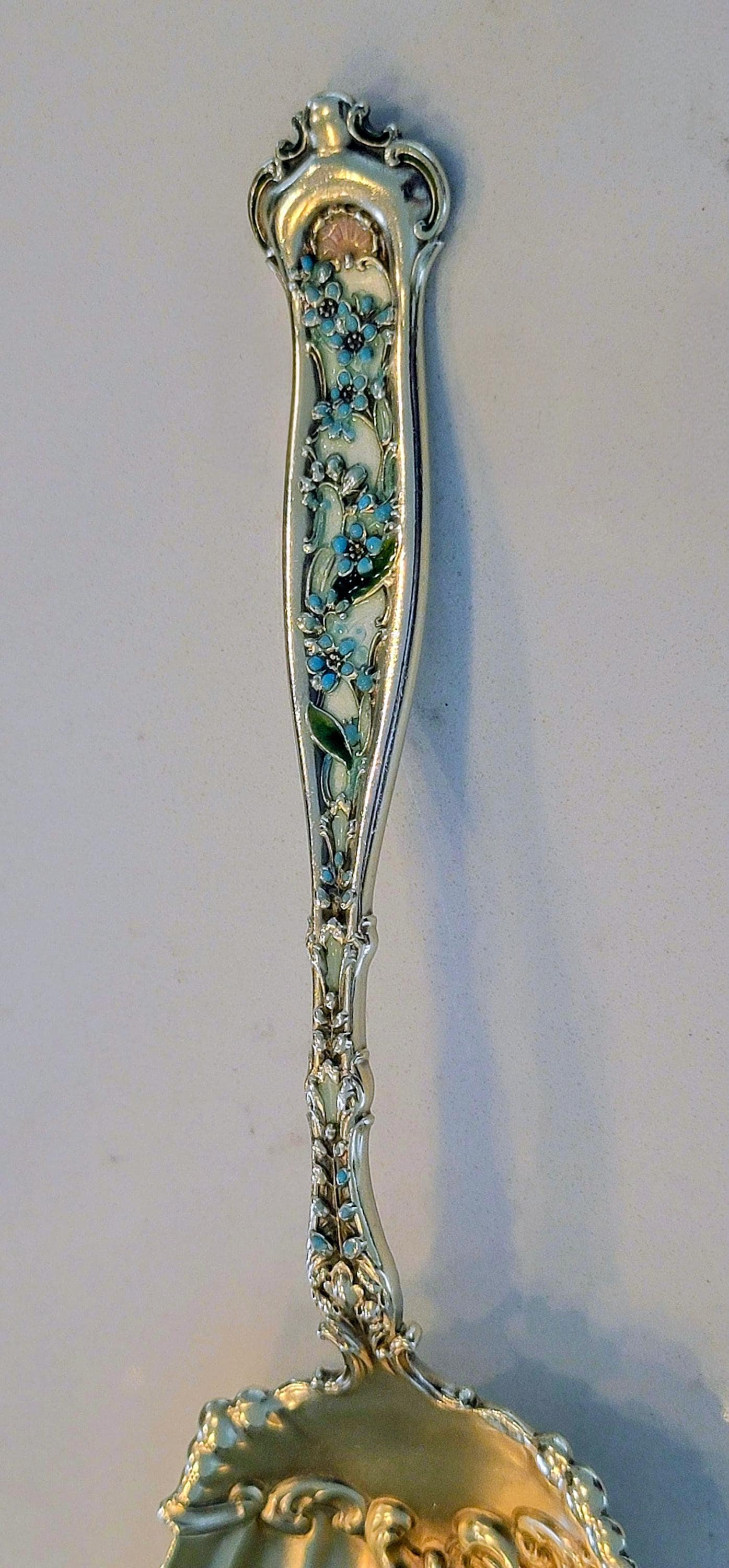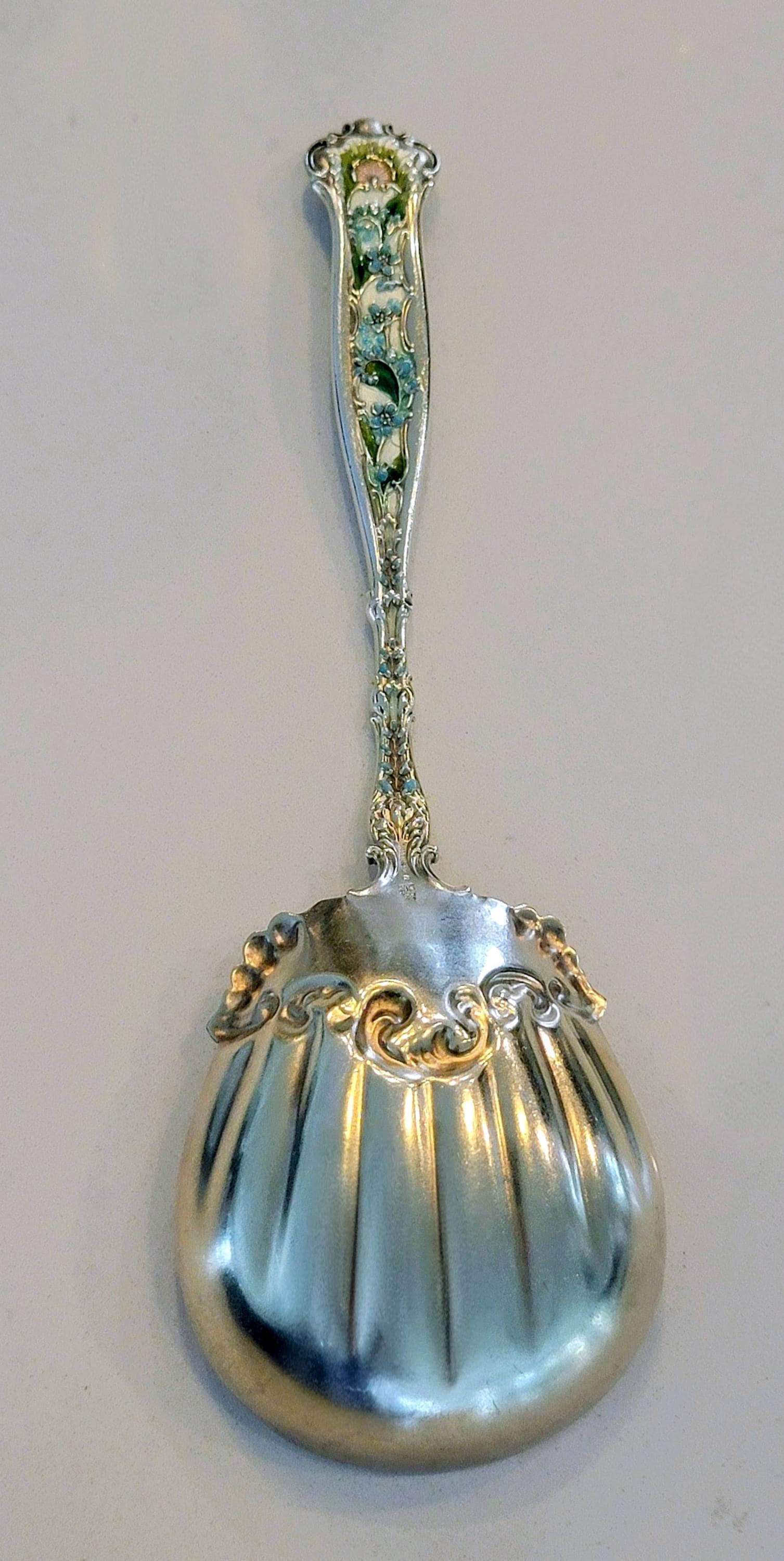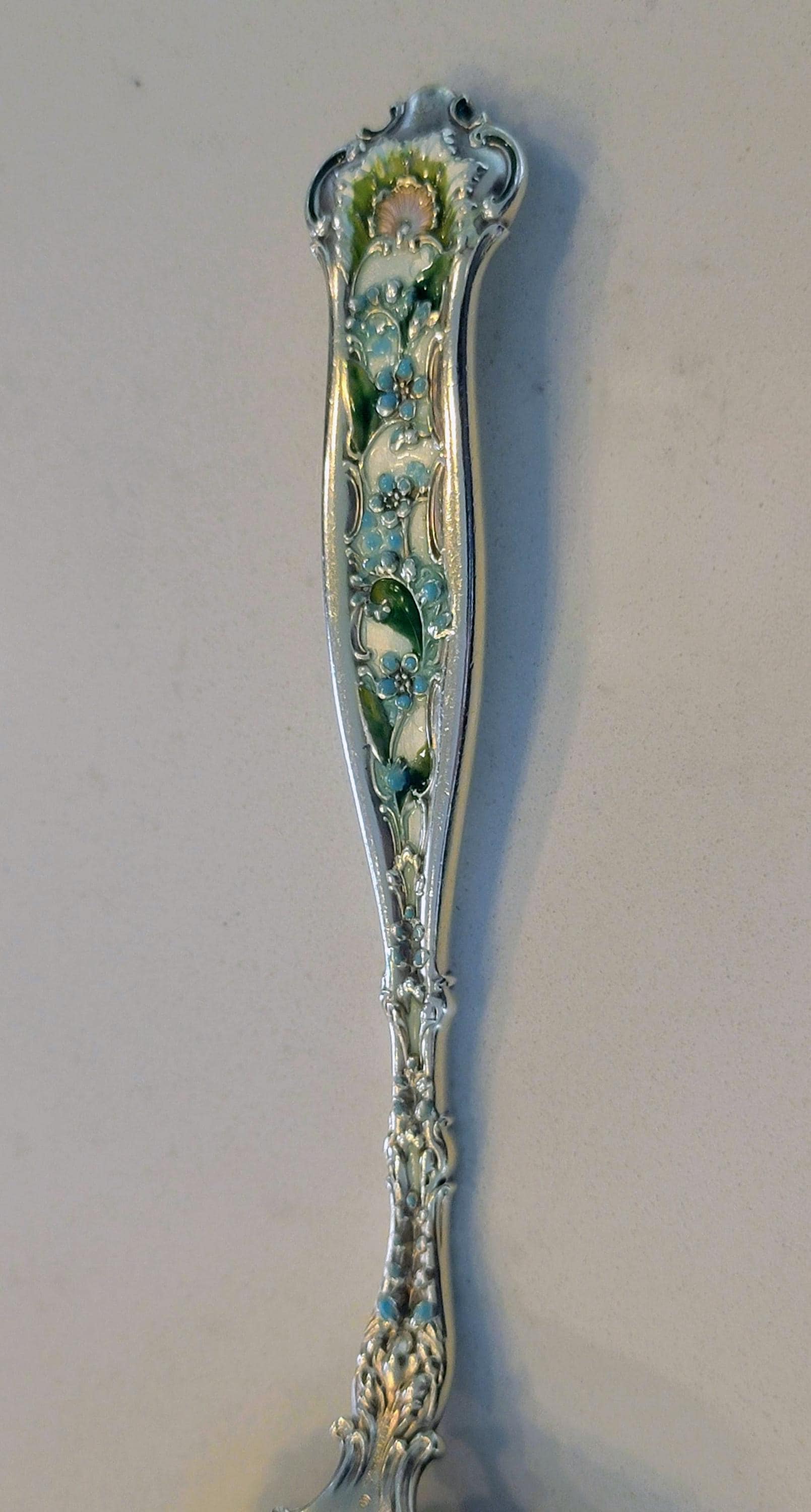 Featuring white enamel base color with turquoise flowers, green leafs and a pink shell at the top of both sides. A stunning work of silver art!